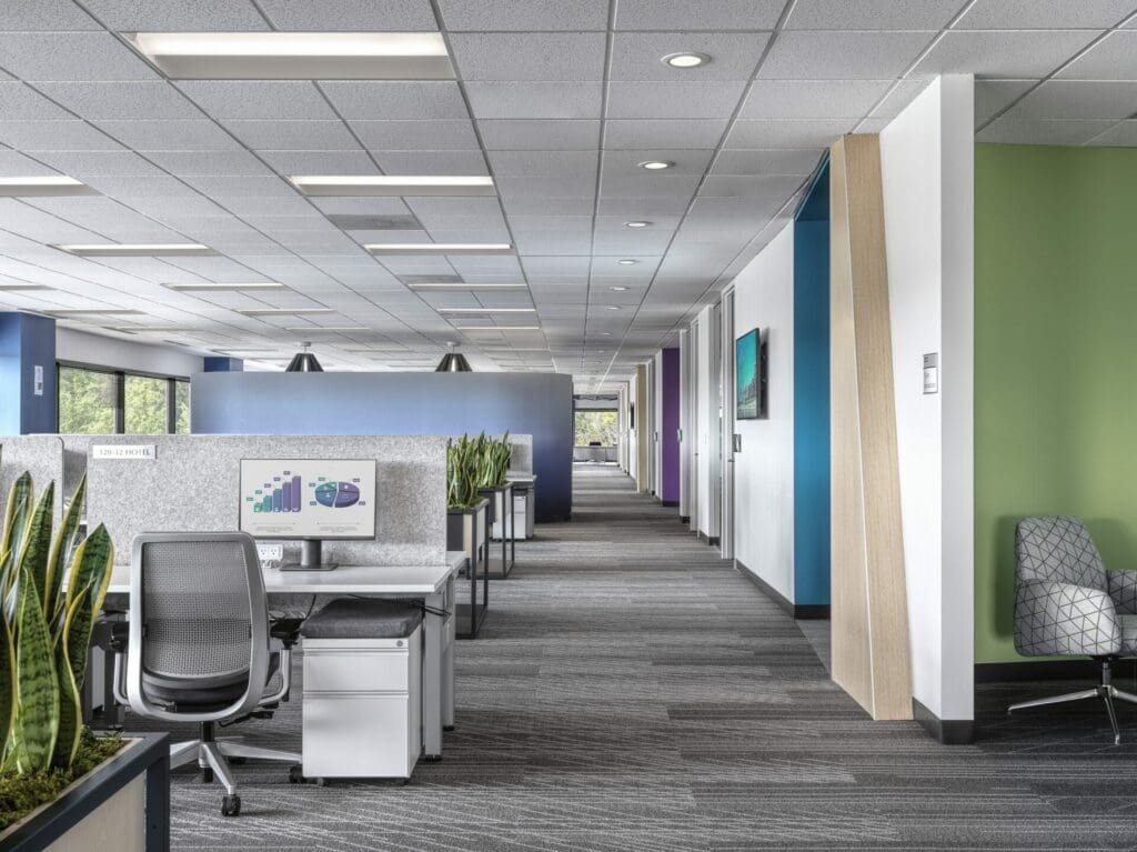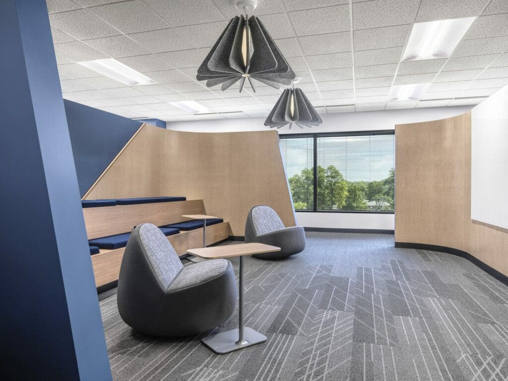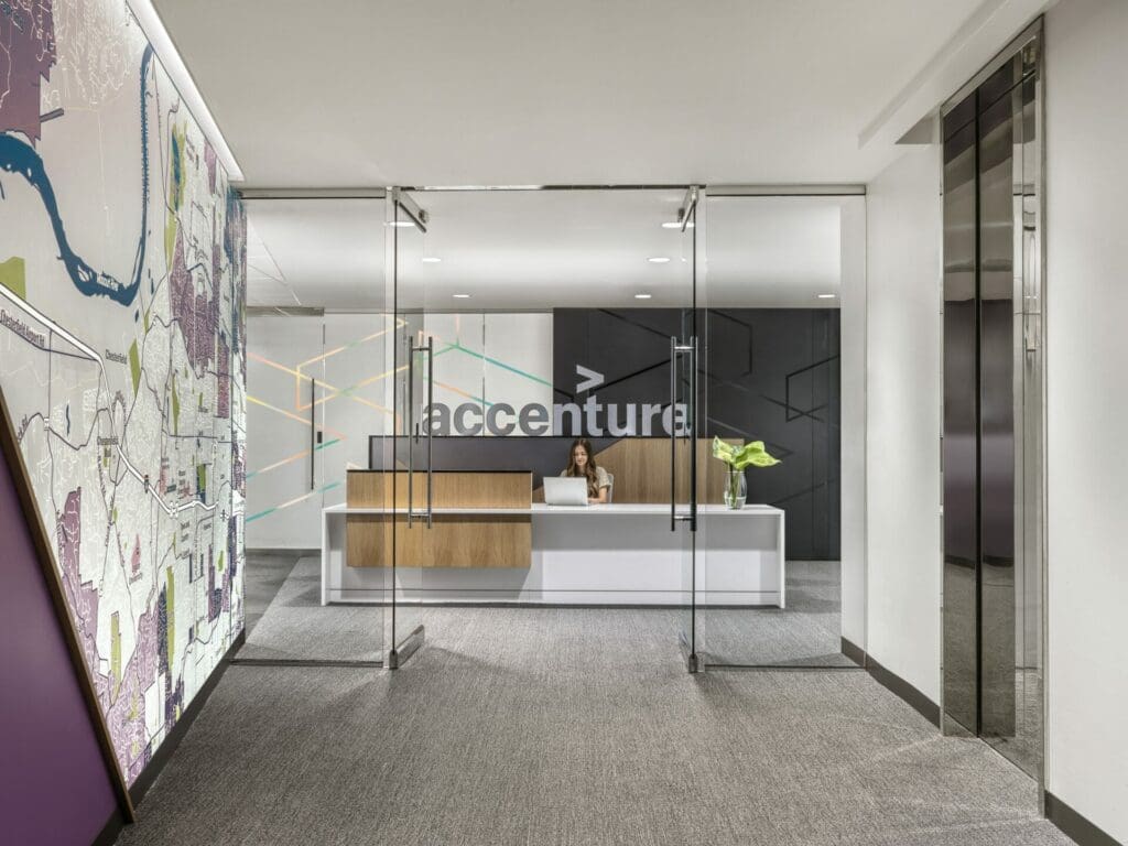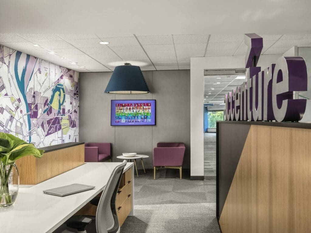 PARIC completed an interior renovation to the Accenture office space in St. Louis, MO in January of 2021. This 23,557 sq. ft. office renovation included open offices, collaboration and conference rooms, a reception area, cafe, mother’s room, wellness rooms, and back-of-house areas. The space features wall coverings, paint, carpet, wood flooring, fabric panels, skyline glass, and back-painted glass.