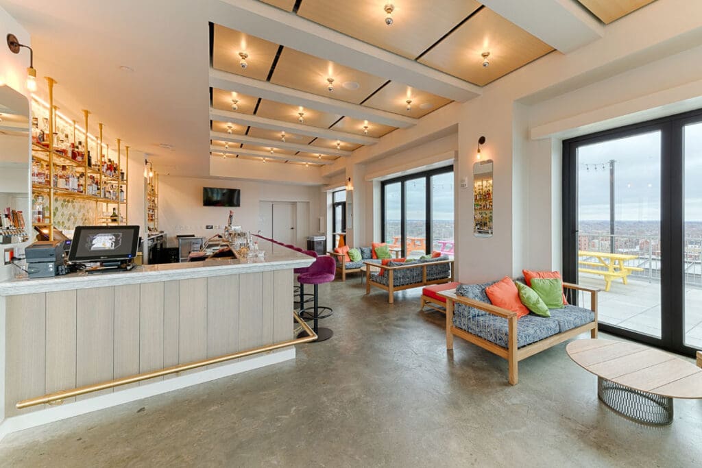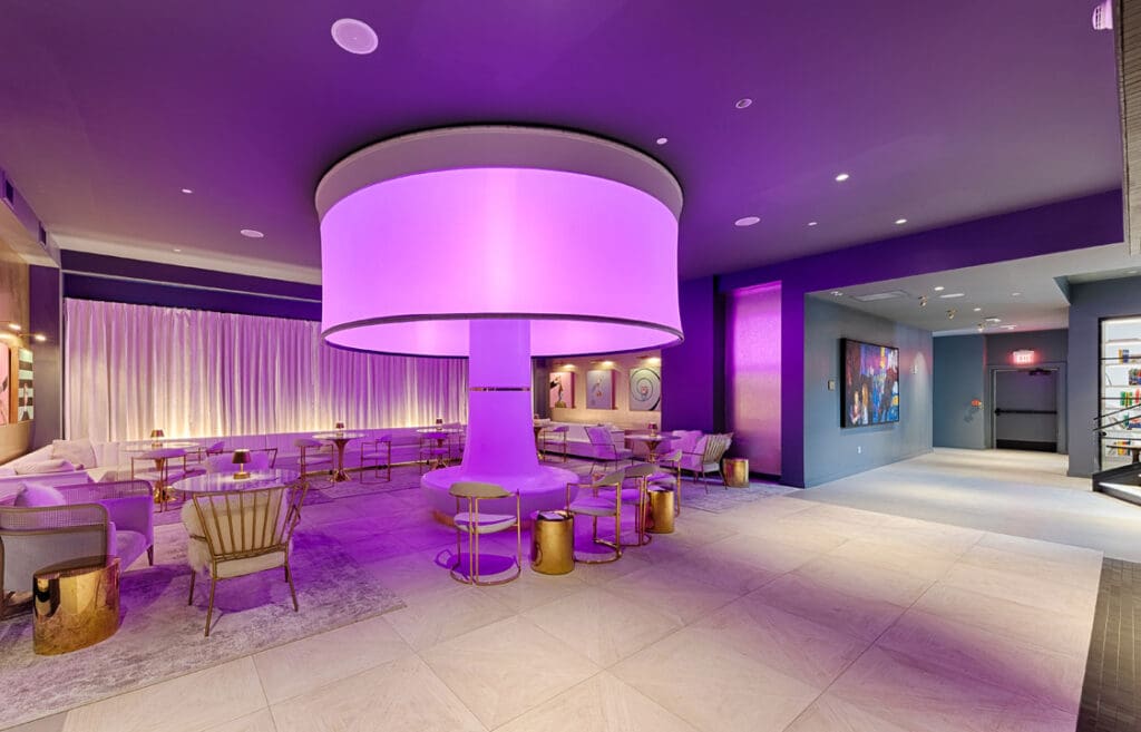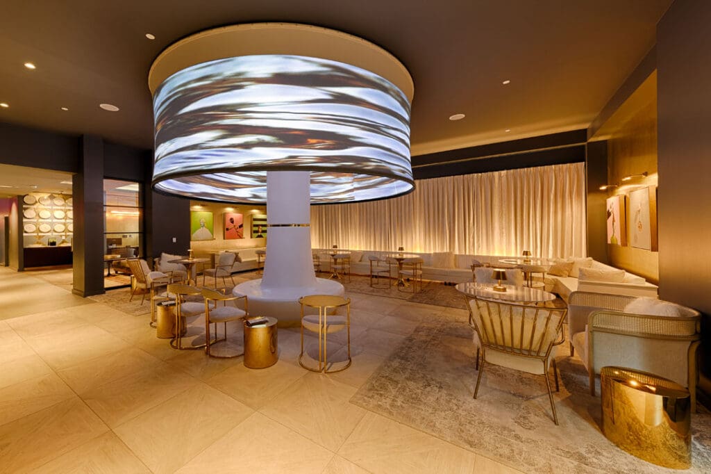 The rooftop Rainbow Terrace lounge includes a bar and indoor/outdoor event space, with views of St. Louis. Also located on the twelfth floor is the sky lobby and Chameleon Lounge which features a 360-degree video art display and bar service.