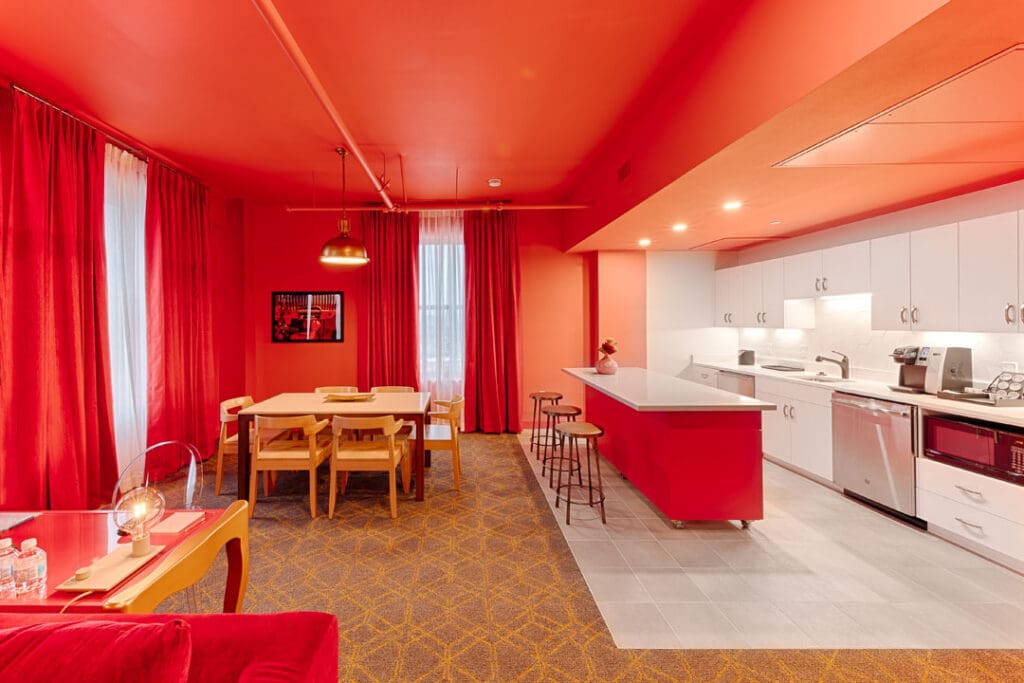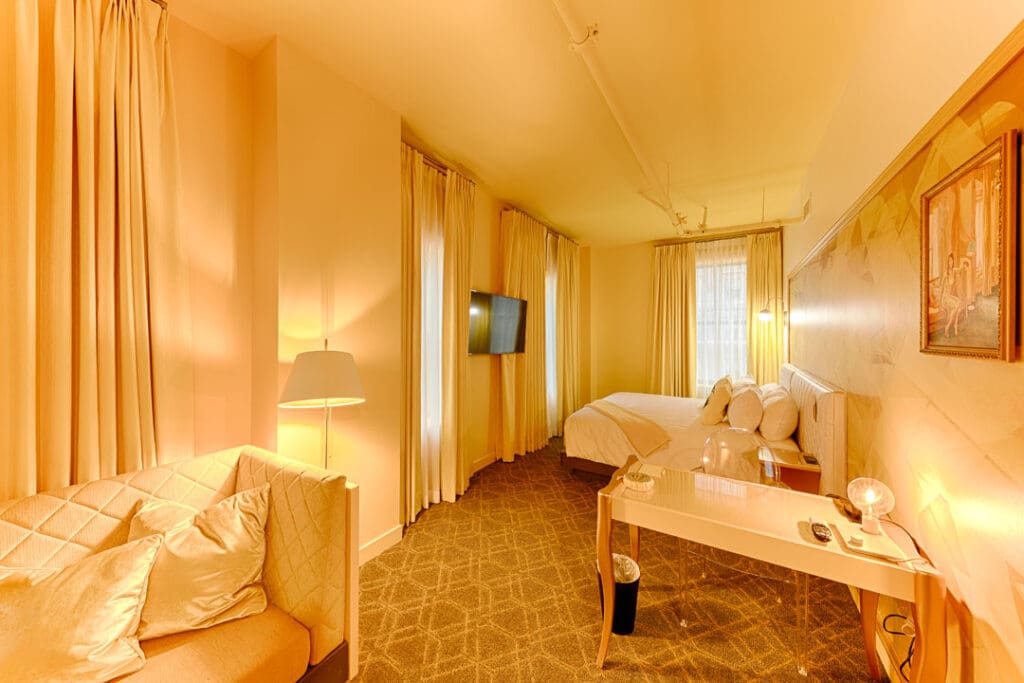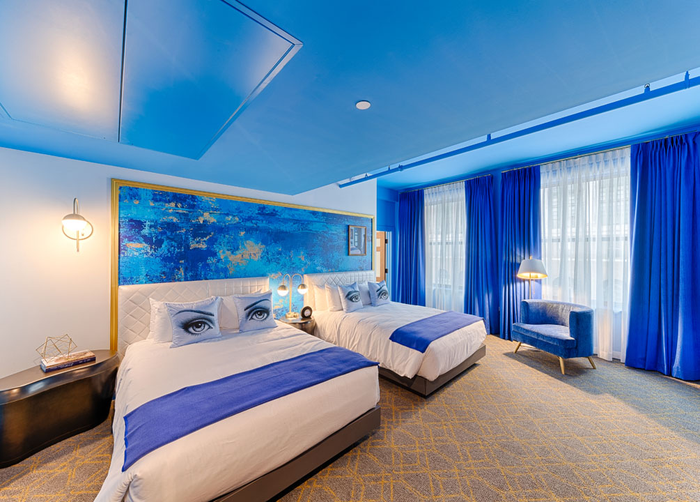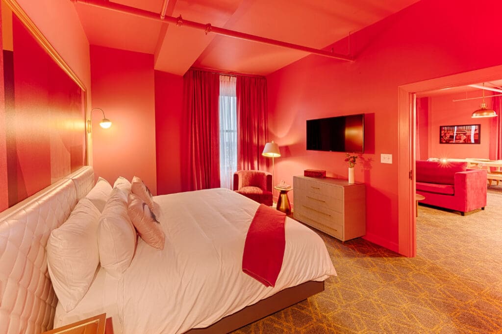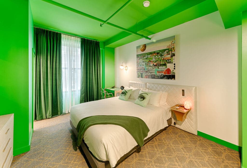 Guests are able to choose their room type as well as their emotion of color. Rooms are available in Passion Red, Tranquility Blue, Rejuvenation Green, and Happiness Yellow. In addition to regular guestrooms, there are 38 suites and 25 extended stay rooms available.