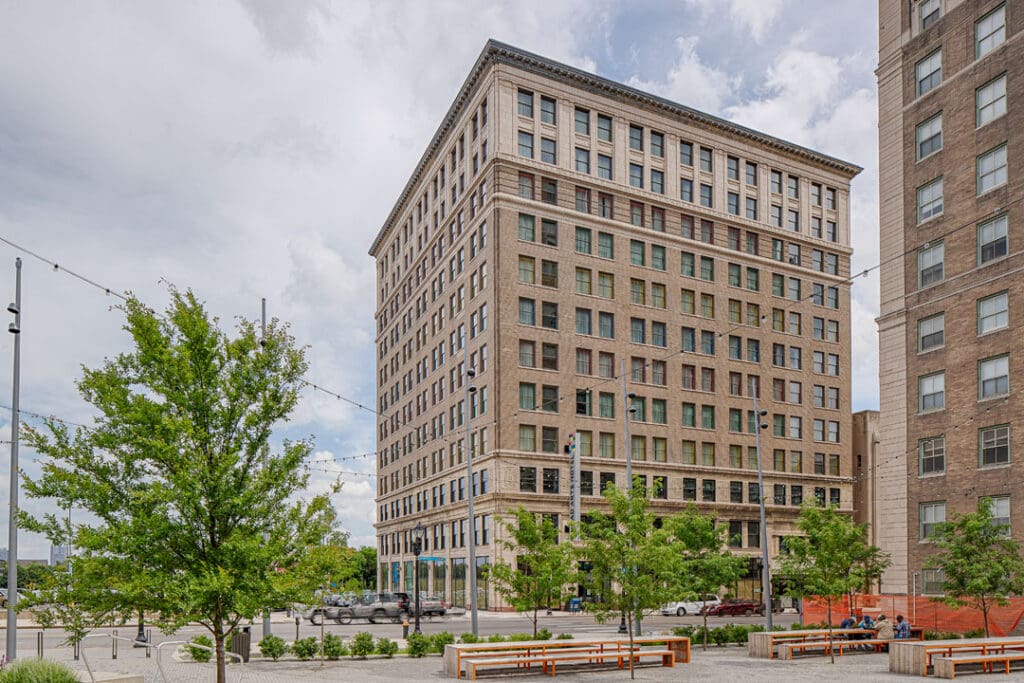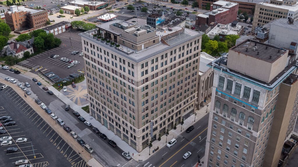 The Angad Arts Hotel is now open in the historic Missouri Theater building in Midtown’s Grand Center Arts District. This long-vacant 12-story building was transformed into a 146-unit boutique hotel with a rooftop bar, the Grand Tavern restaurant, and commercial space.