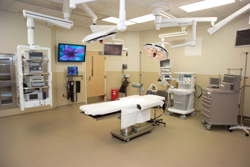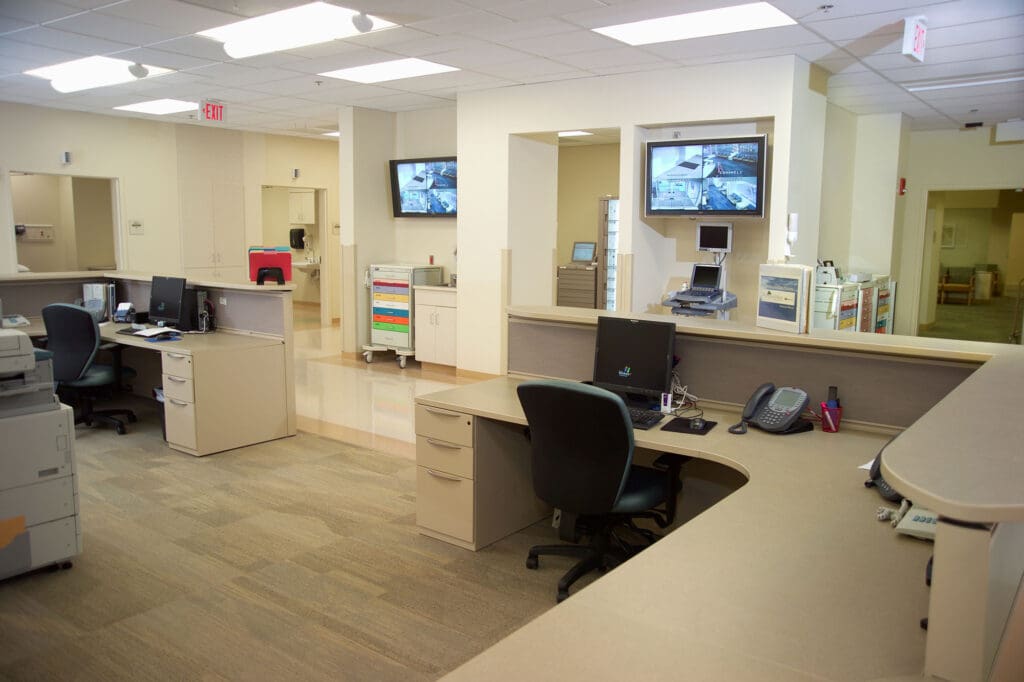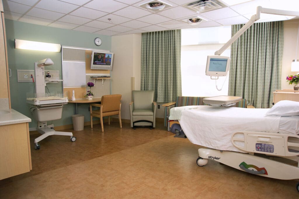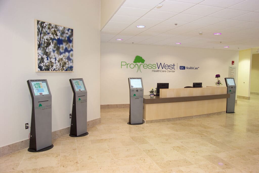 Progress West is designed to feel more like a modern living space than a research driven hospital. A concierge desk is located at the entrance to rooms, resembling hotel spaces, and all patient rooms are identical.