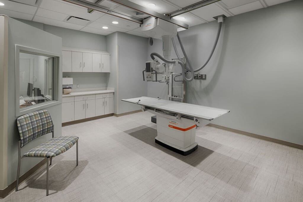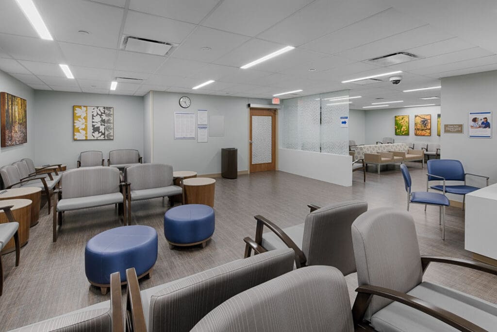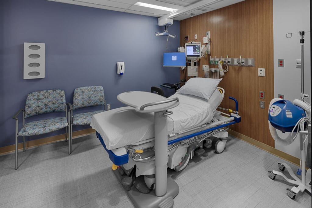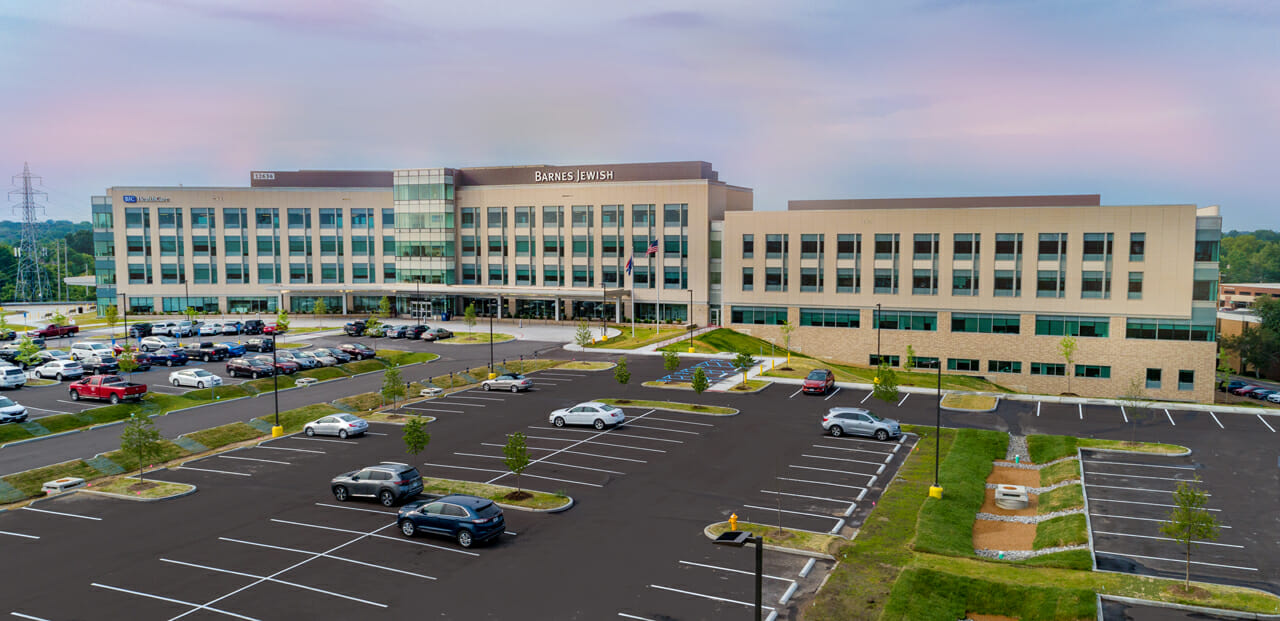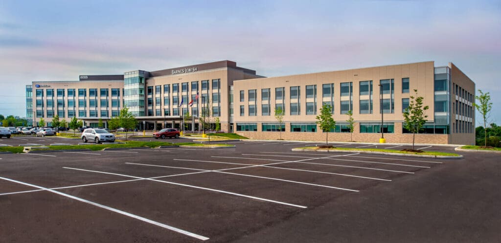 The six-story Barnes-Jewish West County Replacement Hospital is a 260,000 sq. ft. structure built directly adjacent to the original hospital. The new facility features 64 private patient rooms, 4 intensive care unit rooms, and 14 operating rooms, a new emergency department, interventional radiology department, 4 floors of physician office space, underneath parking, with room for future expansion to 100 patient rooms and 16 operating rooms. The new facility also offers an additional 100,000 sq. ft. medical office building.