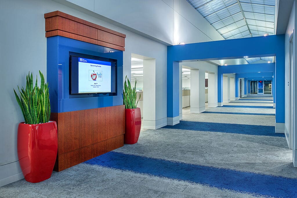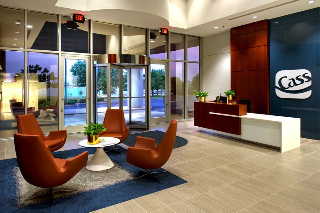 This four-phase renovation to Cass Information Systems’ 62,000 sq. ft. headquarters in Bridgeton, MO includes open-floor-plan office space, multiple conference and collaboration rooms, complete renovation of the restrooms, and total renovation to the bank — all without disrupting the day-to-day operations. The lobby prominently features two media walls with full-height Bubinga Wood wall panels, as well as a full paneled Bubinga Wood wall in the customer conference room.