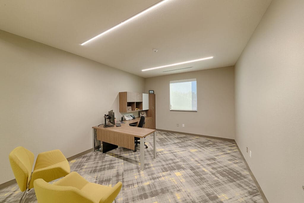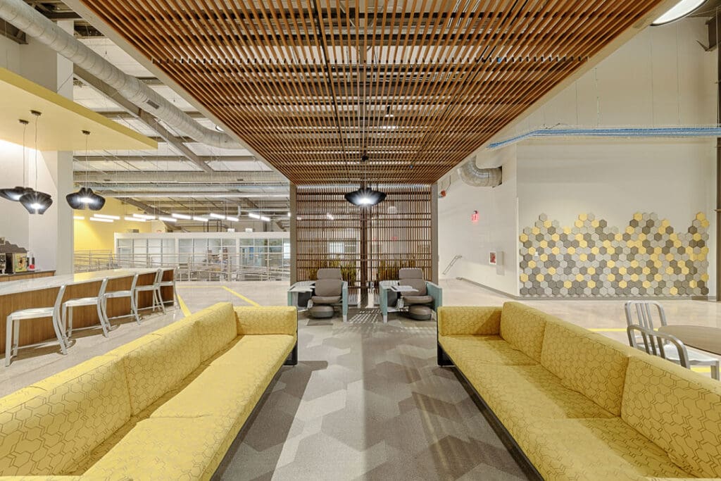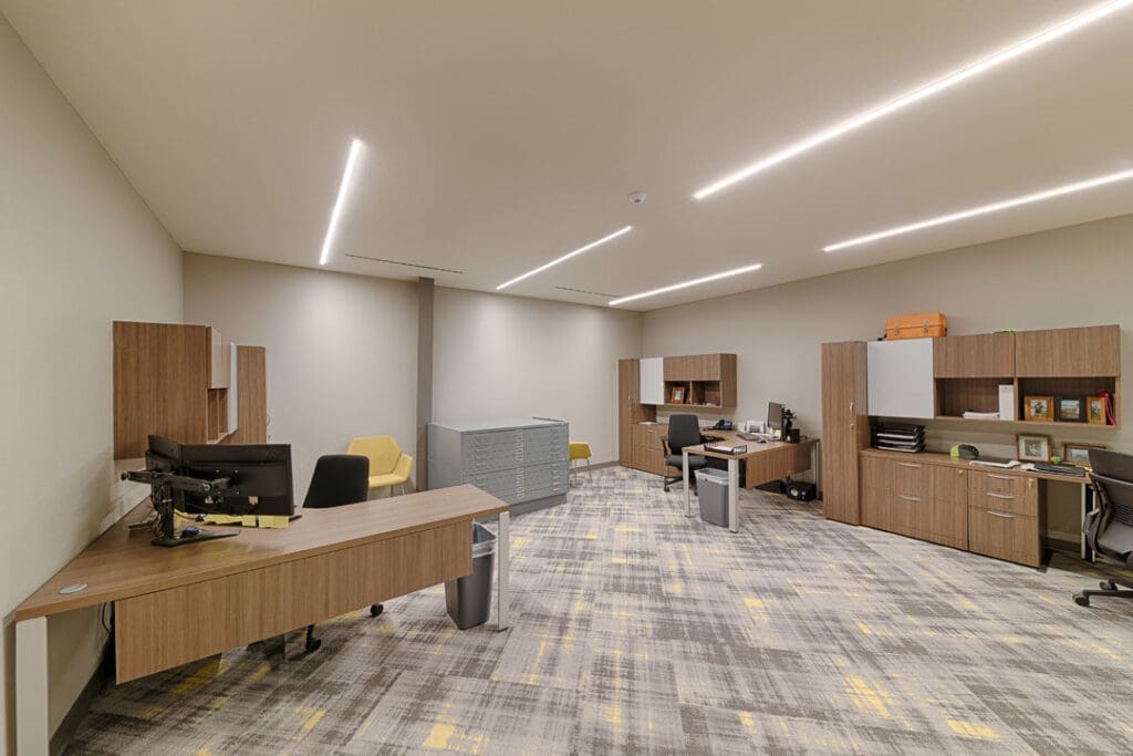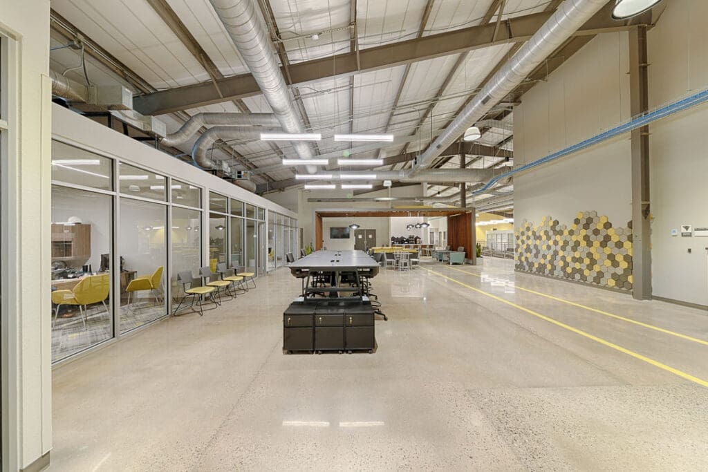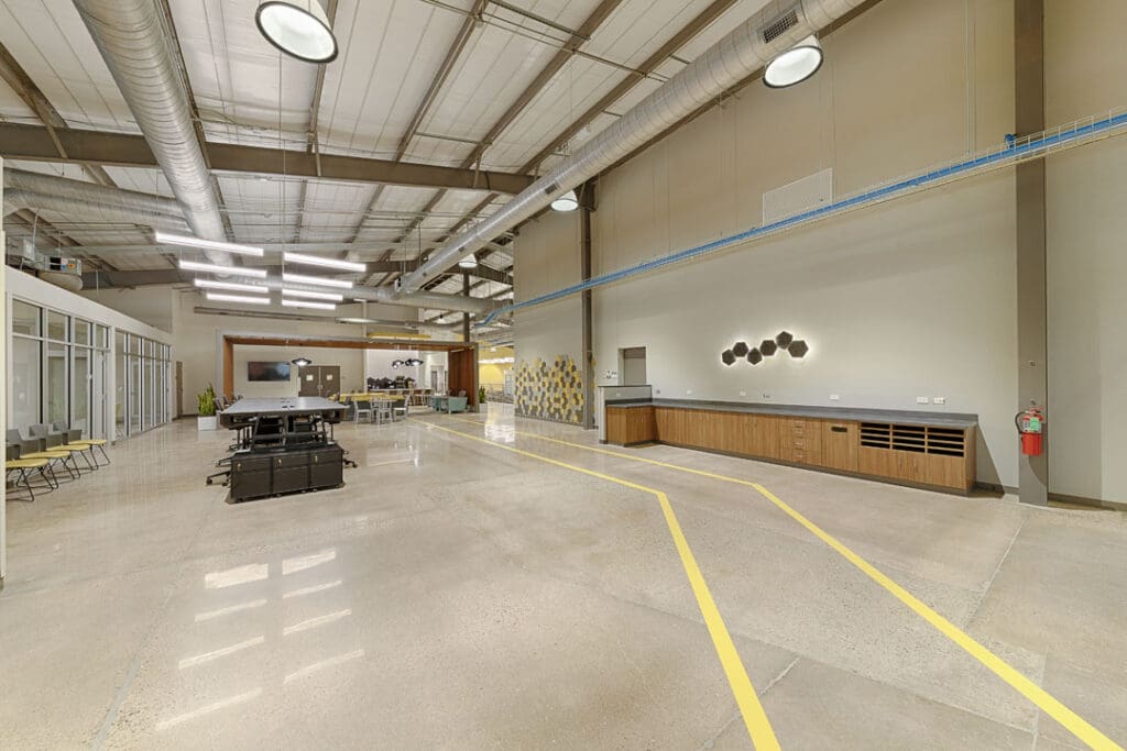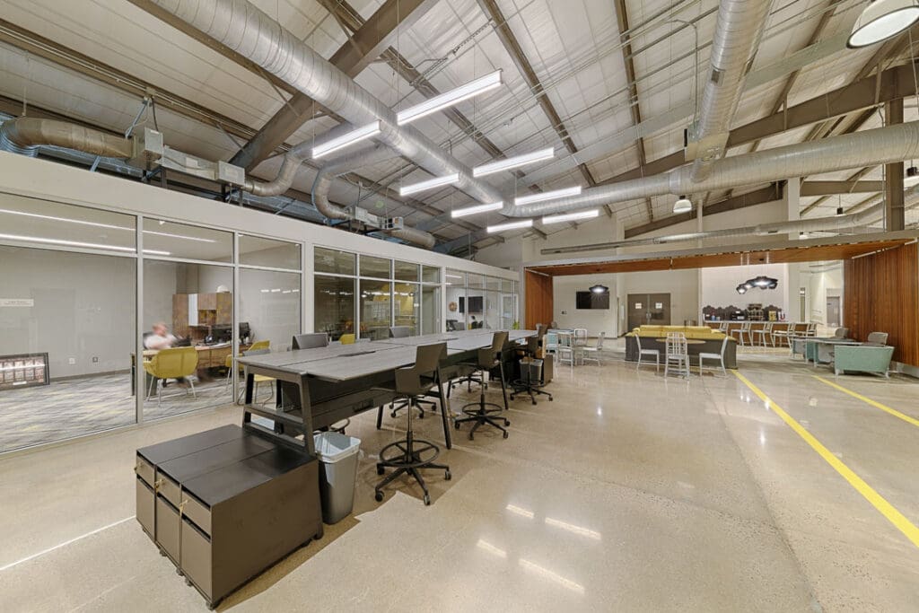 The existing warehouse was transformed into a new engineering and operations center and with an open concept office with an industrial feel. The original warehouse building was built with a pre-engineered steel building design and was modified to increase natural daylight into the space. A storm-hardened area for disaster recovery and protection of critical operations was also added.