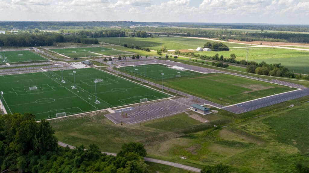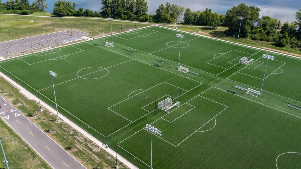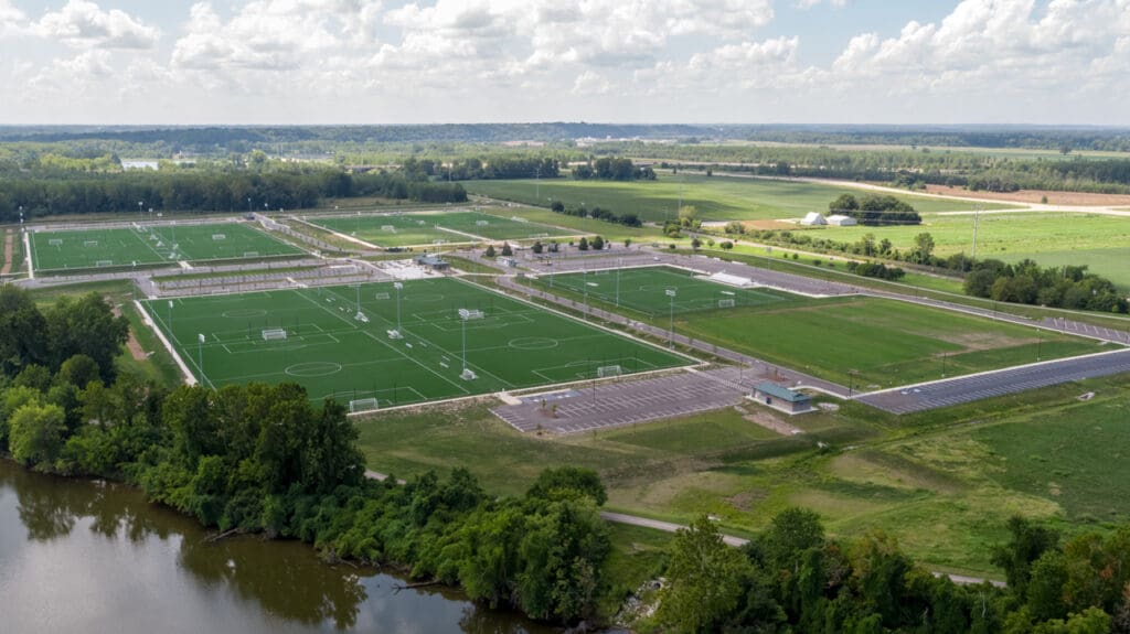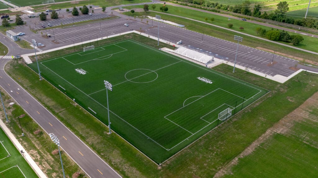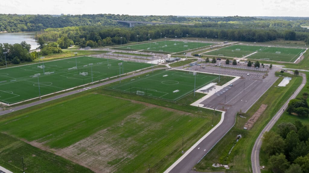 The St. Louis County Soccer Park is an 82-acre project consisting of a Central Village with a concession stand and restrooms, new satellite restrooms and concessions stand on both the north and south side of the site, the addition of ten new turf fields, two new grass fields, and one new championship turf field with stadium seating. To accommodate new foot traffic, parking was also expanded to accommodate 1,200 vehicles total, and existing park trails were relocated.