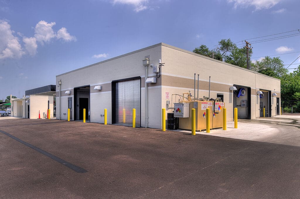 The buildings were completed using drilled piers, concrete foundations, CMU block walls, and metal framing. The final product features a 12,000-gallon underground fueling tank for the gas station, underground water reclaim tanks to operate the two car wash bays, a maintenance bay with supplemental car lifts, as well as specialized brand-specific steel canopies, booths and traffic control units with automated spike strips.