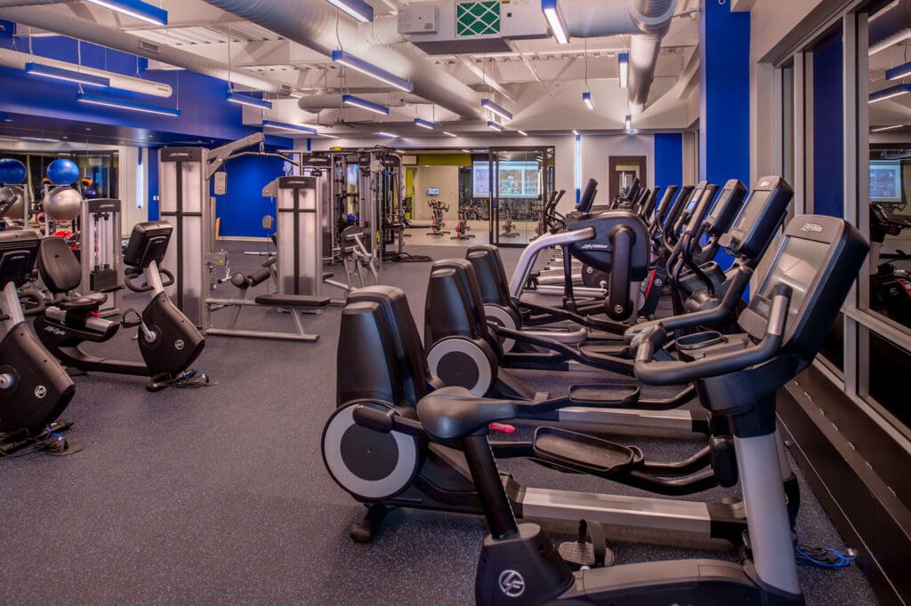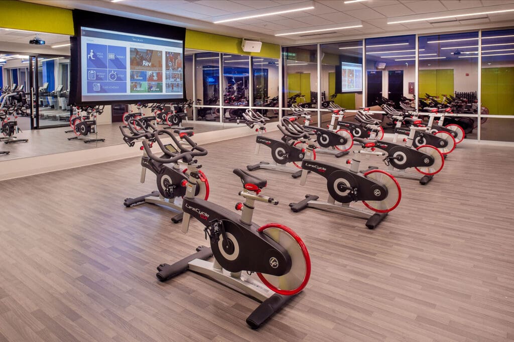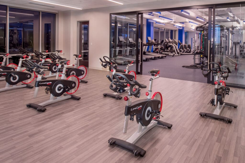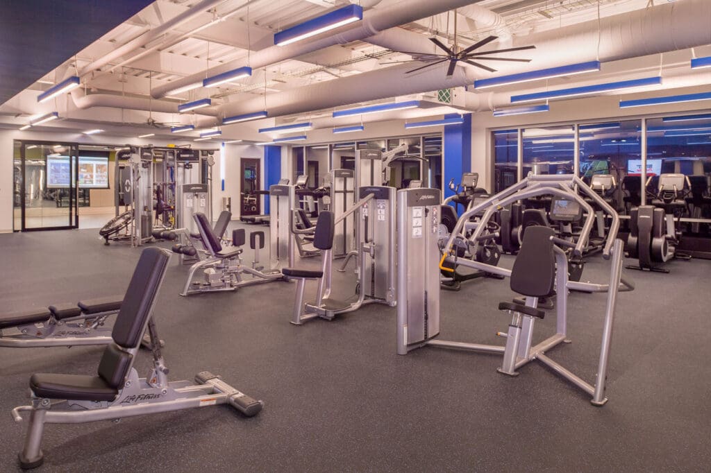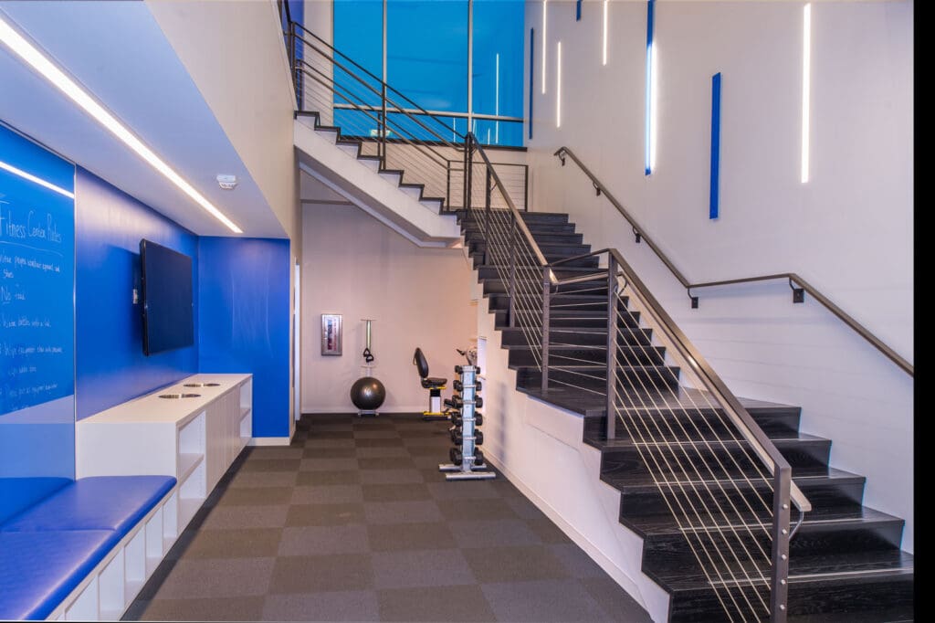 Renovations to the HQ 1 building included over 40,000 sq. ft. of renovations, which contained office space on the first floor and lower levels, office space conversion into conference rooms, and private phone rooms. The fitness center was expanded to include both the first floor and lower level and was connected by a feature stair. The remaining office area was converted to a conference center with hospitality area.