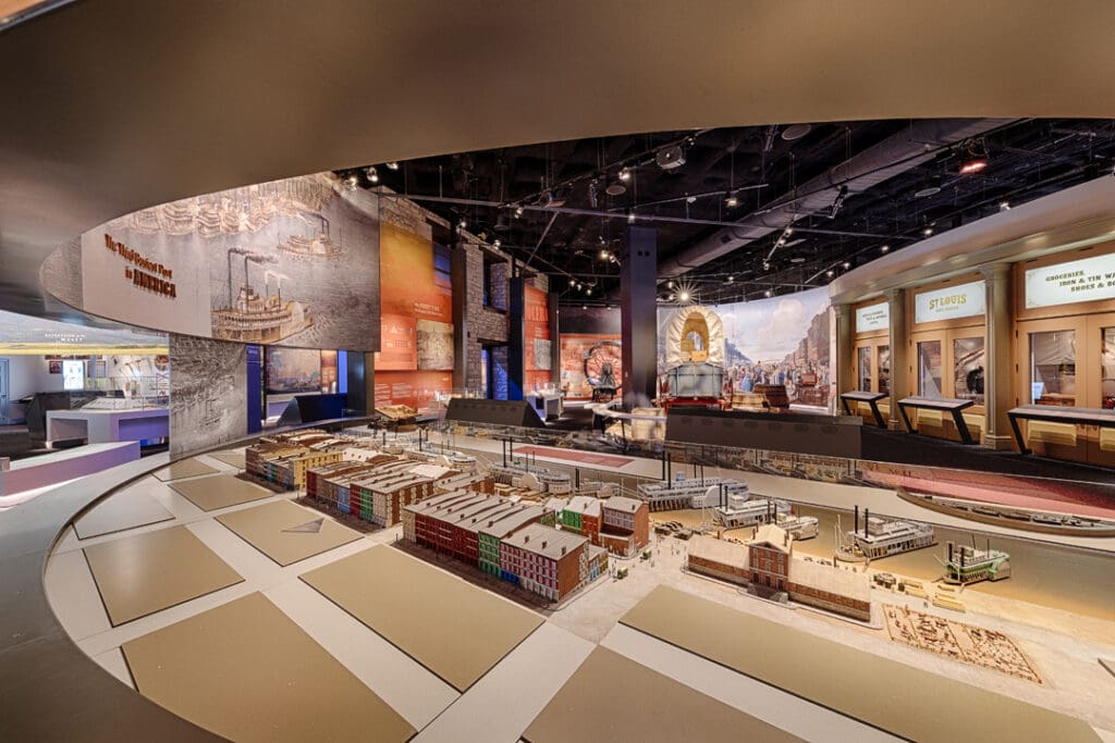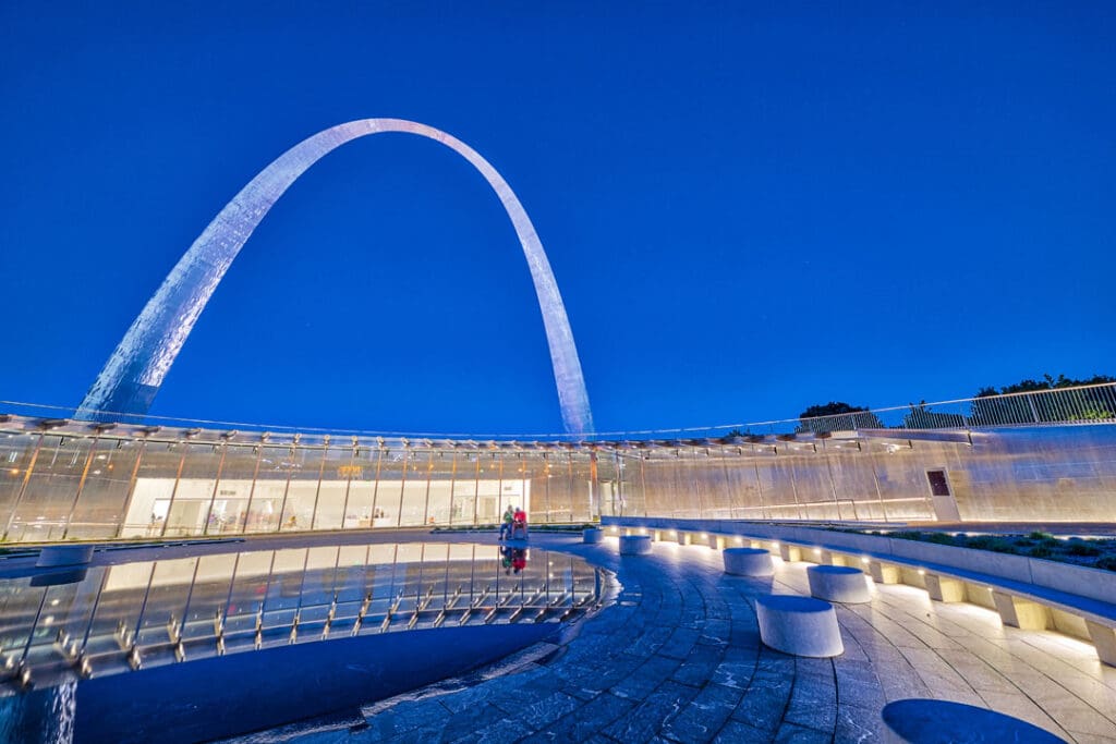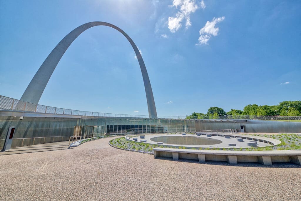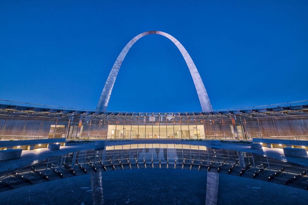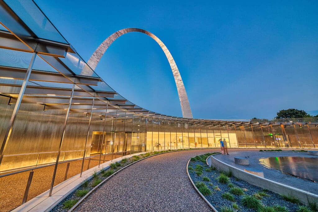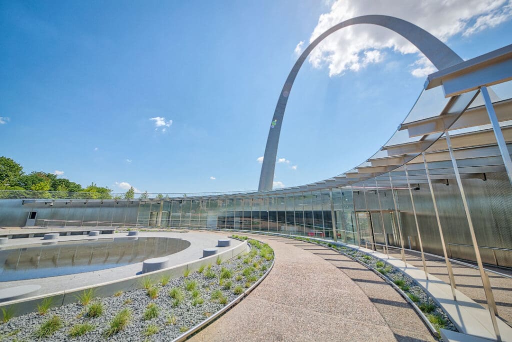 The updated Arch museum features a curved glass entrance, cut into the ground with a water feature in the center. 46,000 sq. ft. were added to the museum, to create a more open feel, and new lighting was added throughout.