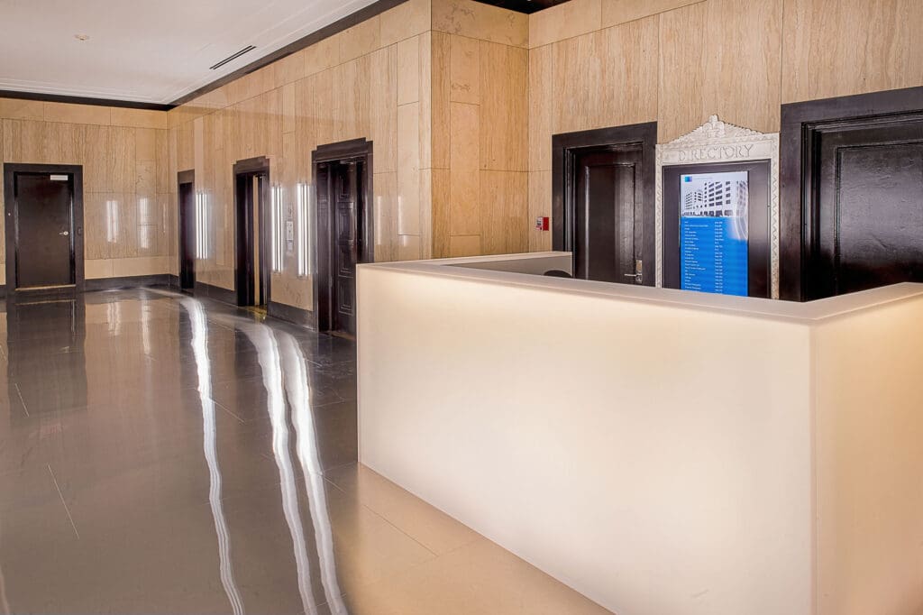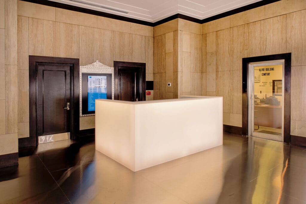 The Globe Building renovation included repairs to the basement of an existing facility, such as a new drainage system, utility lines, a new structural wall and renovations to the Globe Building’s lobby and main entrance. Recent renovations include improvements to the garage access stairs, the elevator and the restrooms.