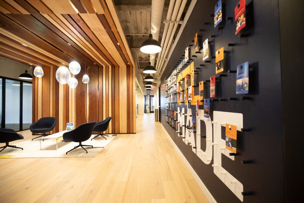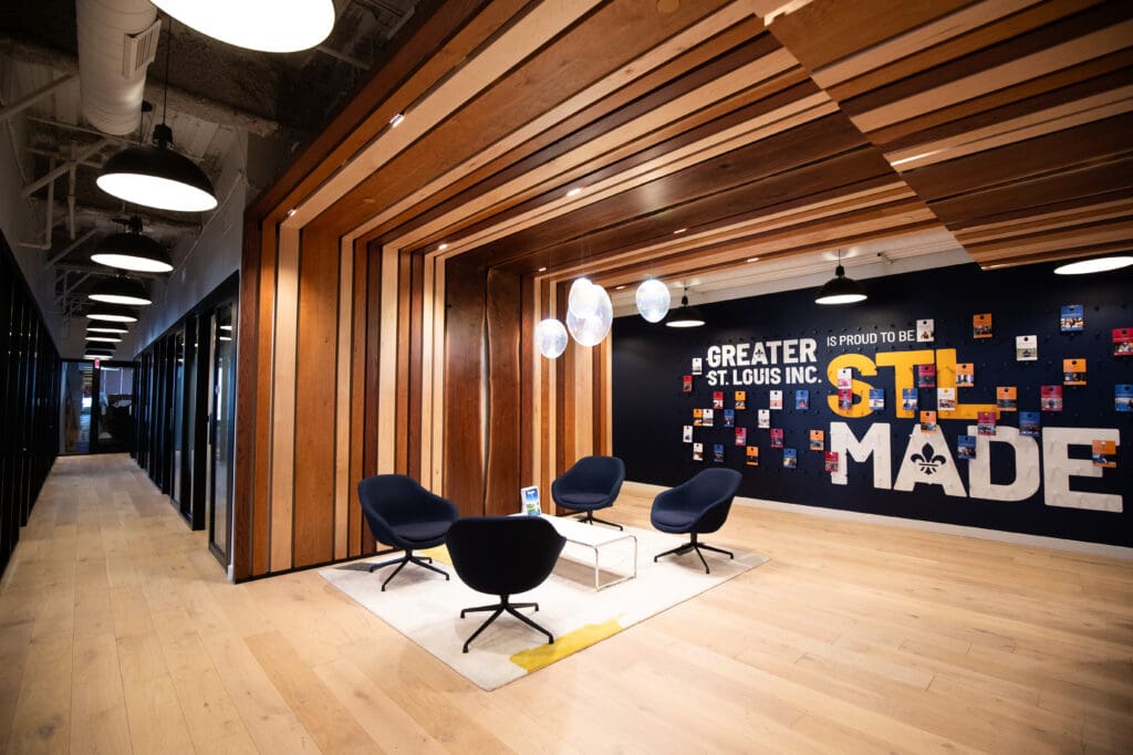Greater St. Louis, Inc. chose PARIC for the renovation of their 25,000 sq. ft. office on the 22nd floor of the Metropolitan Square Building in downtown St. Louis. The project scope included the demolition of existing elements, repurposing and relocation of portions of existing window framing system and glazing, and the rework of existing lighting. Additional lighting systems were installed along with new LED signage.