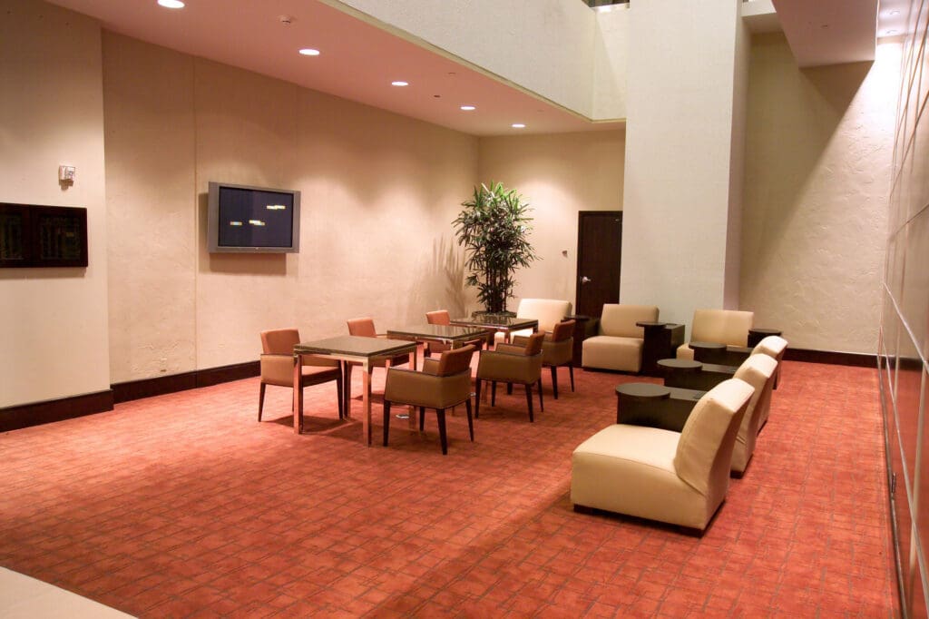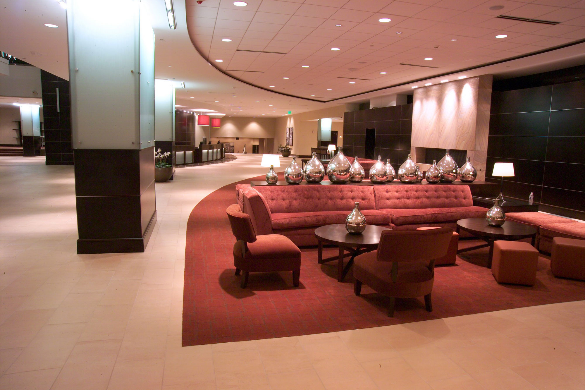 The new finishes include two colors of granite floor tile with patterned carpeted areas throughout the lobby and circulation areas. The new wall finishes include stained hardwood panels, stainless steel and glass handrails with decorative glass columns that are back lit to provide a dramatic impact in the lobby. The new gypsum boards and suspended ceilings have decorative pendant and recessed down light fixtures throughout the new lobby area and a new linear fireplace with stone veneer panels.