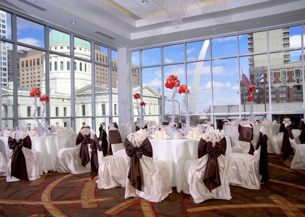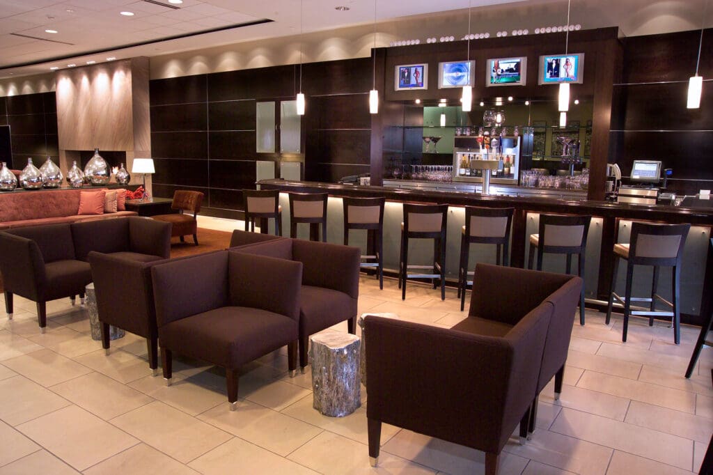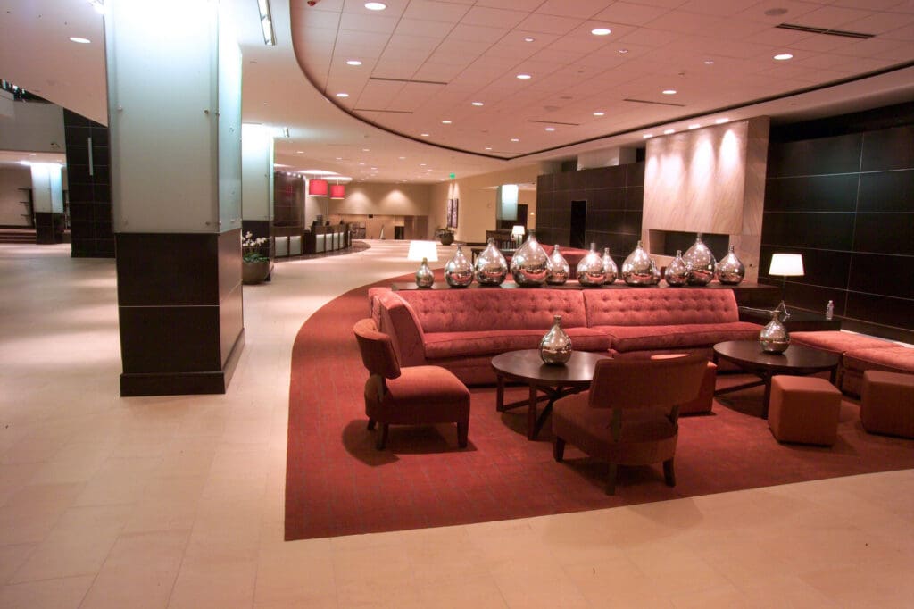The renovation of the Hilton Ballpark Hotel in downtown St. Louis features a complete re-design of the hotel’s main entry with a new drop-off area and cantilevered canopy. The new contemporary hotel design continues into the lobby and registration area with updated finishes throughout the public areas, including the soft seating, bar areas, and circulation corridors. The Starbucks Cafe was completely redesigned, relocated, and enlarged to a prominent location in the hotel lobby. The ballrooms and meeting rooms were updated with new lighting and finishes.