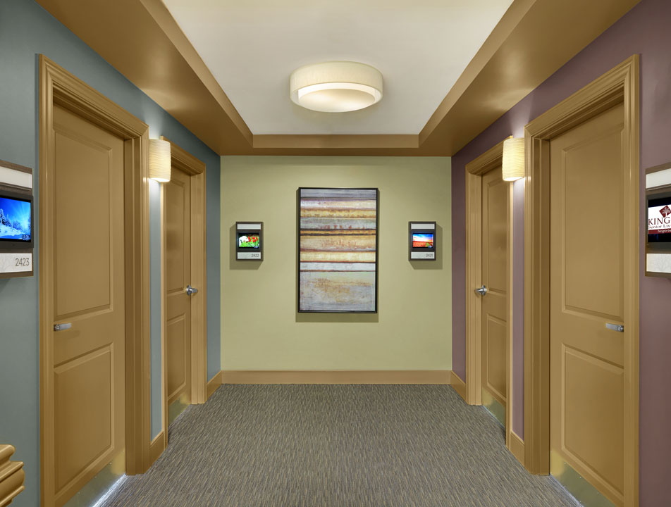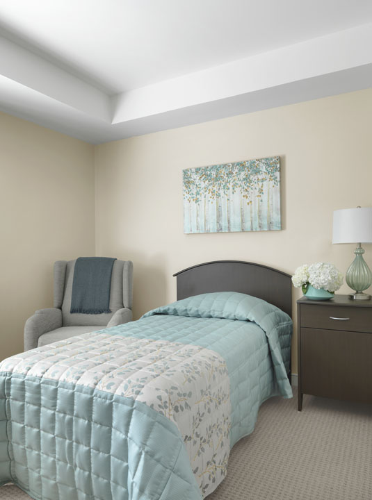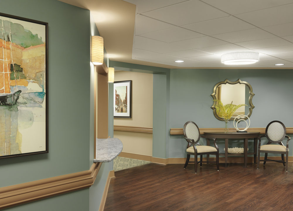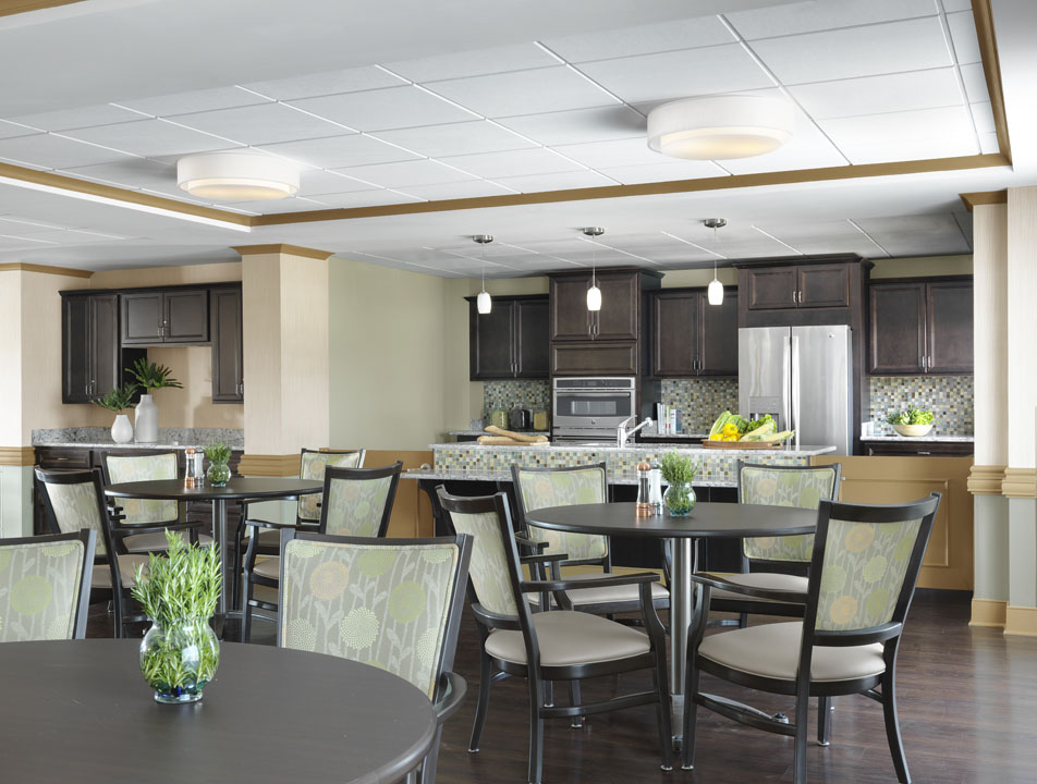 Conversions to the north wing of the campus included one full floor of memory support and two floors of assisted living spaces. Each of these floors include common area kitchens, bathrooms, and entertainment areas so residents don’t have to travel far to the main commons building for amenities and activities.