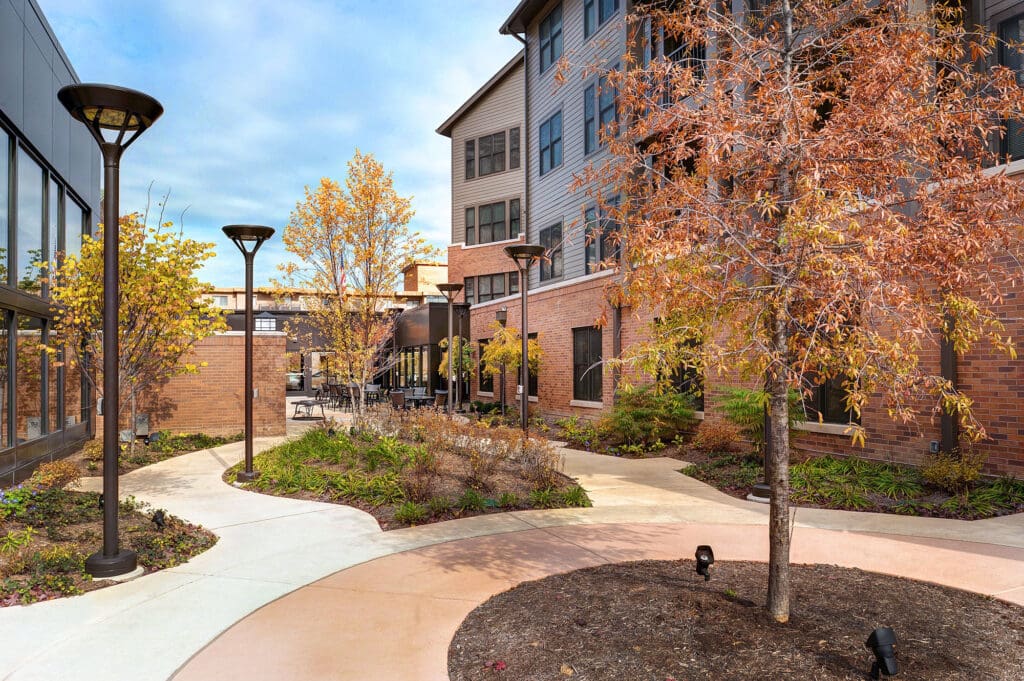 Streets and sidewalks were realigned throughout the campus for better traffic flow and safer walking areas. As a part of the sidewalk realignment, all stairs and curbs were eliminated, and sidewalks were re-built to ensure that only modest slopes are present to ensure residents are able to comfortable walk throughout the rolling, treed campus.