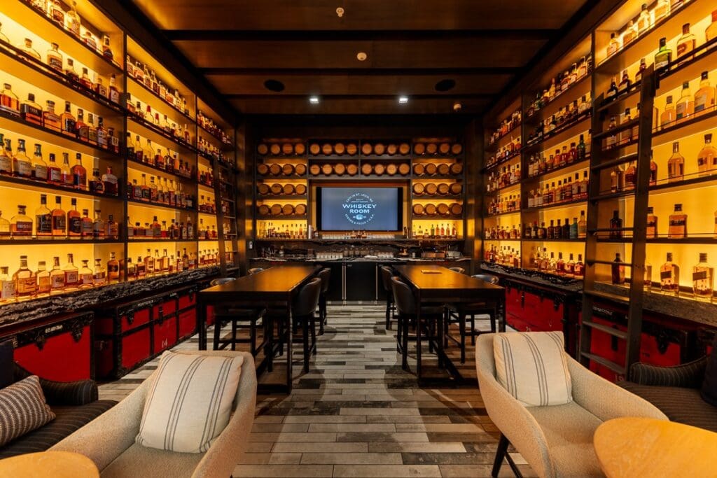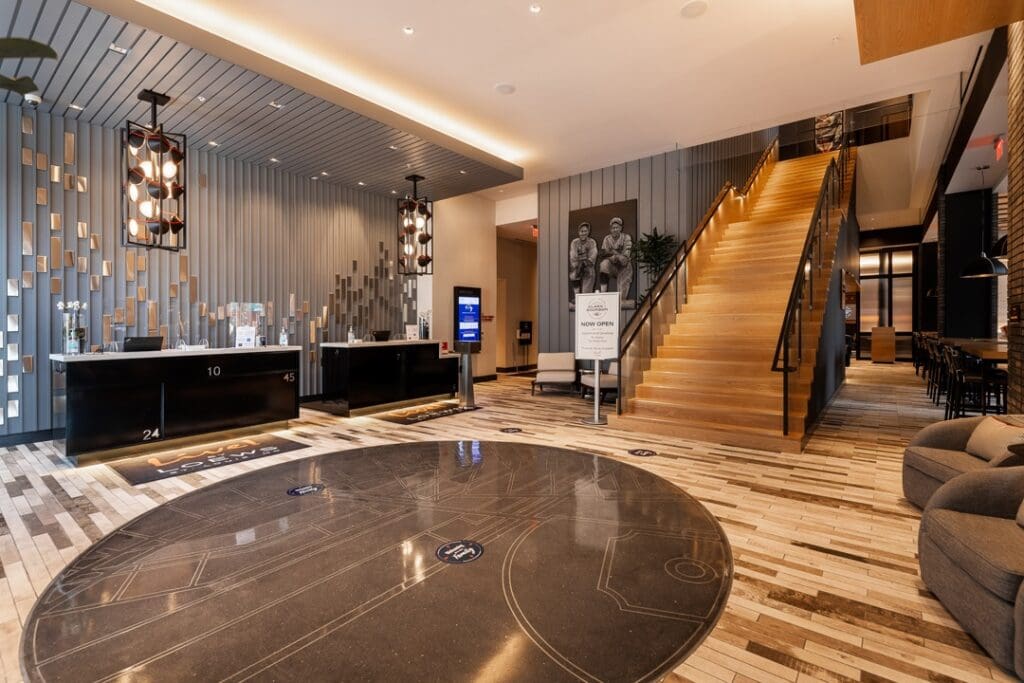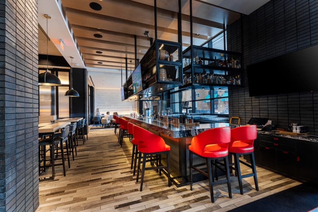 A great room lounge and outdoor terrace, located on the first floor, provide guests with premier food and beverage offerings, private dining, and an exciting A/V space that showcases sports, entertainment, and art.