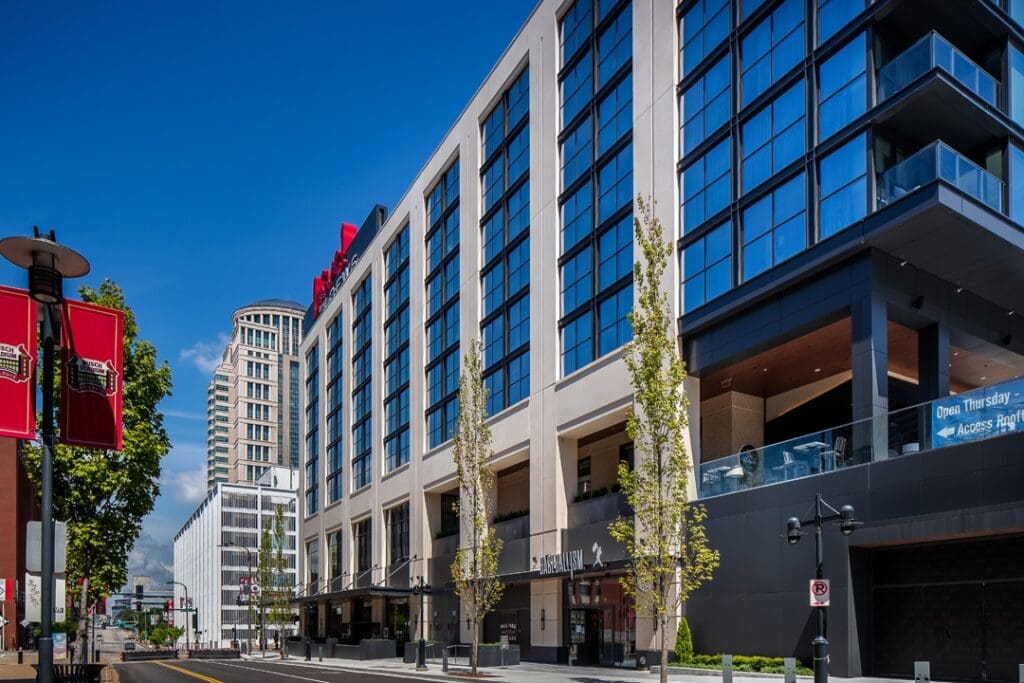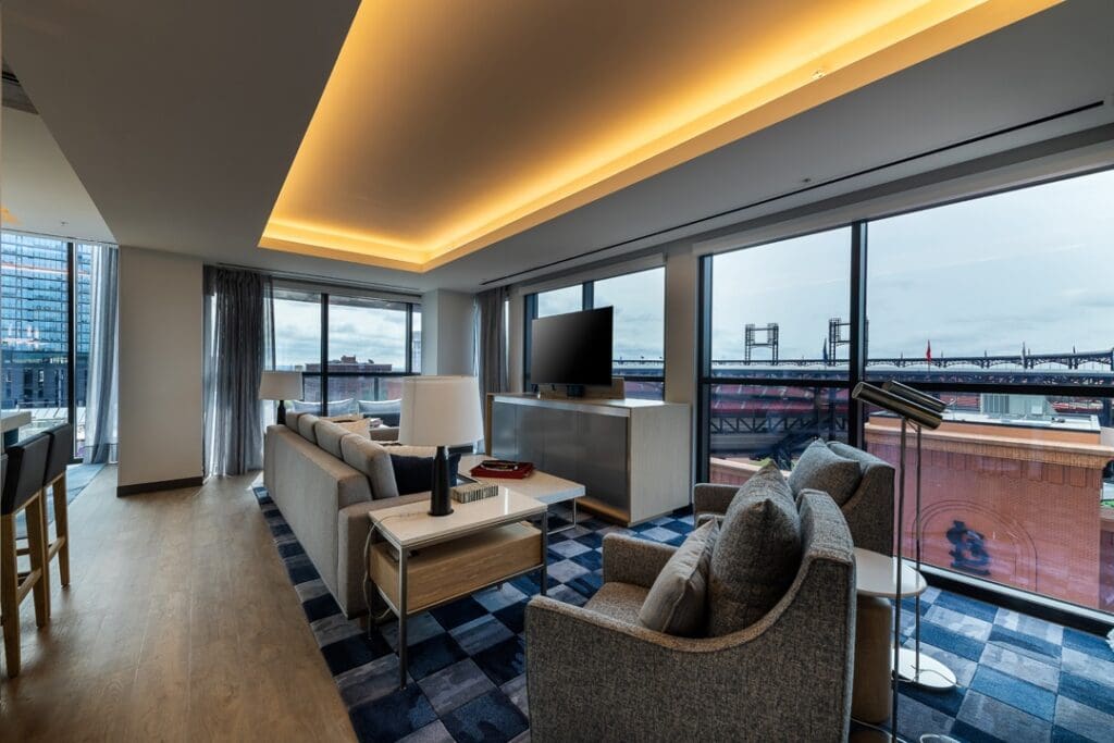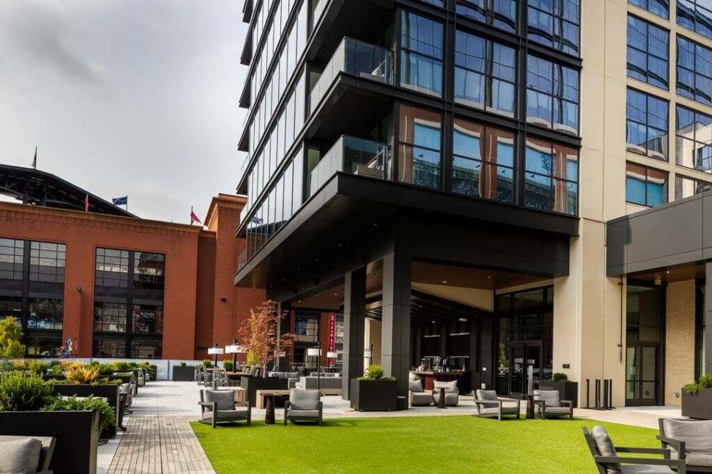 This eight-story upscale hotel, part of the second phase of Ballpark Village and located directly across from Busch Stadium, features 216 luxury guest rooms, 19 suites, and an exclusive fitness facility. The 17,000 sq. ft. meeting and special event space boasts views of Busch Stadium, downtown St. Louis, and the Gateway Arch. The hotel also includes a grand ballroom, an executive boardroom, break-out meeting rooms, and an exclusive outdoor event terrace.