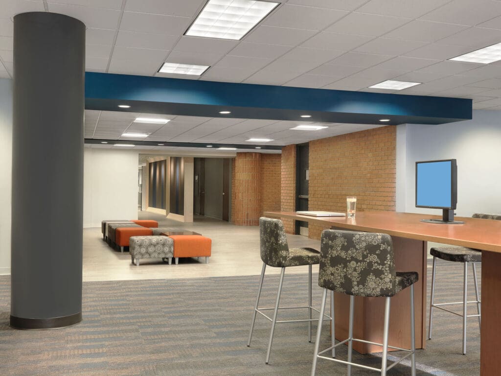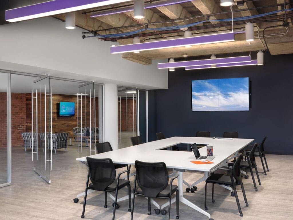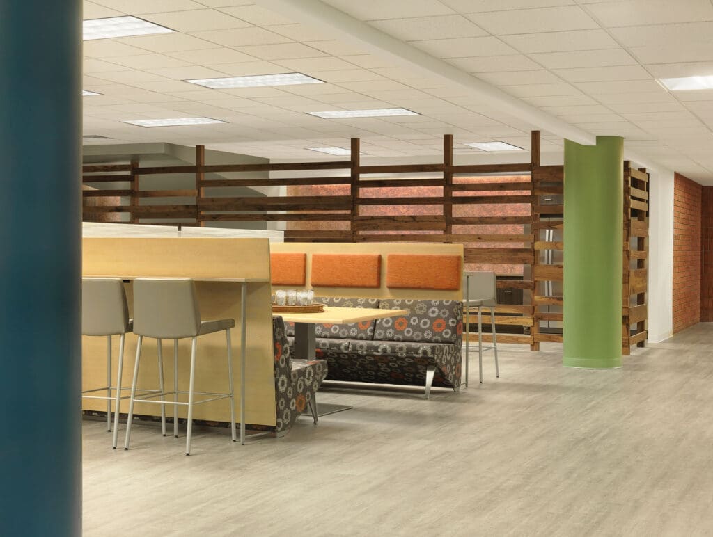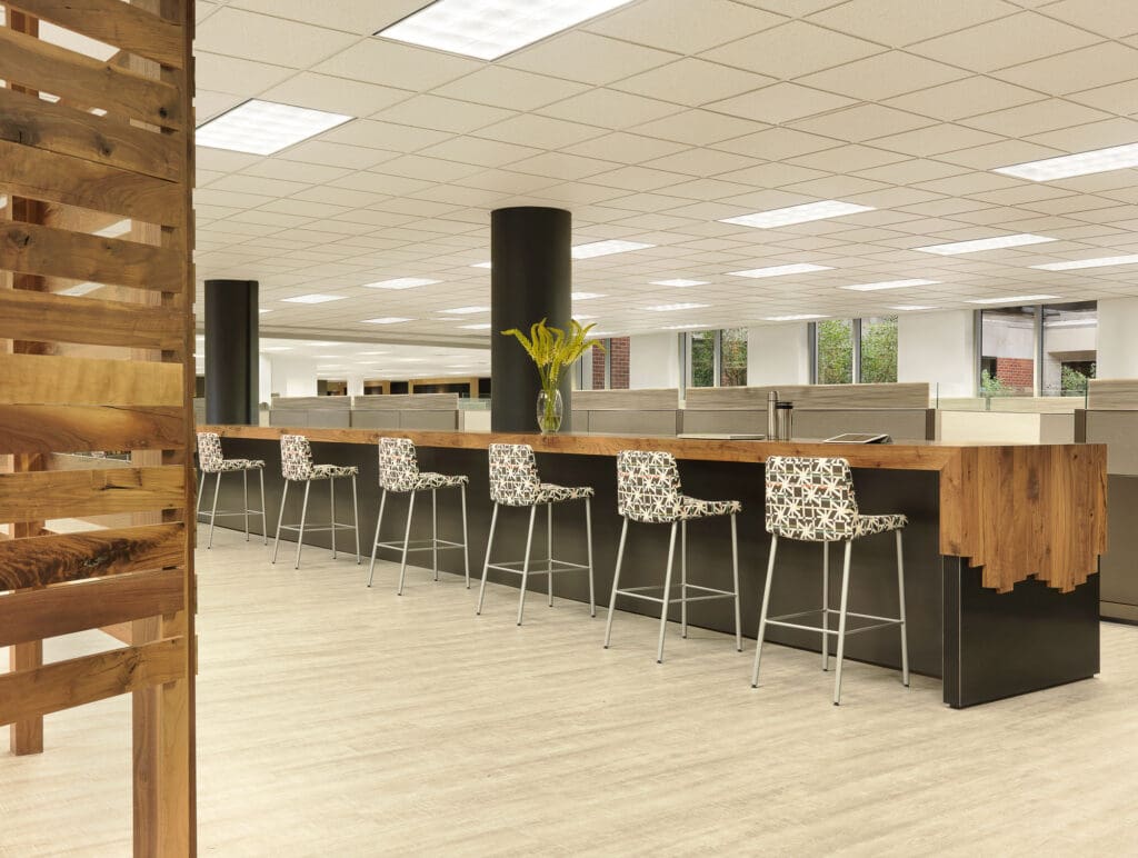 PARIC completed a 95,000 sq. ft., three-floor office renovation for the Maritz headquarters in Fenton, Missouri. The project consisted of updating Maritz’s office floor plan by eliminating most of the interior partitions and making space for modern office workstations. DIRTT partitions were installed for new conference rooms and reclaimed wood was used to separate the new break areas from the working areas by constructing slat walls. Reclaimed wood was also used to construct custom fabricated collaboration tables with integral power and data.