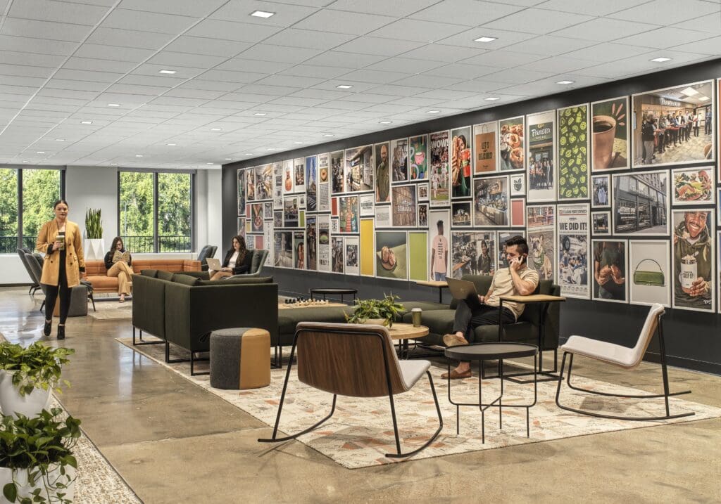 Panera’s new headquarters combines modernization and greenery with a first-floor work cafe equipped with a kitchen, open seating and patio. The exterior space includes a 4,000 sq.ft. bocce ball court and covered gathering spaces.