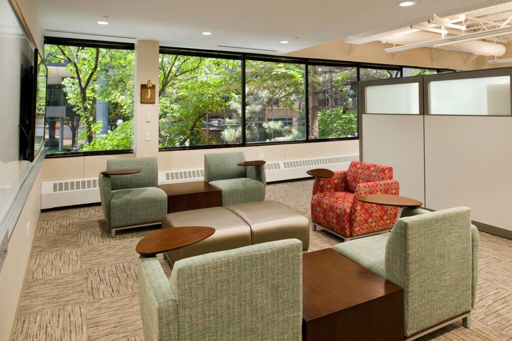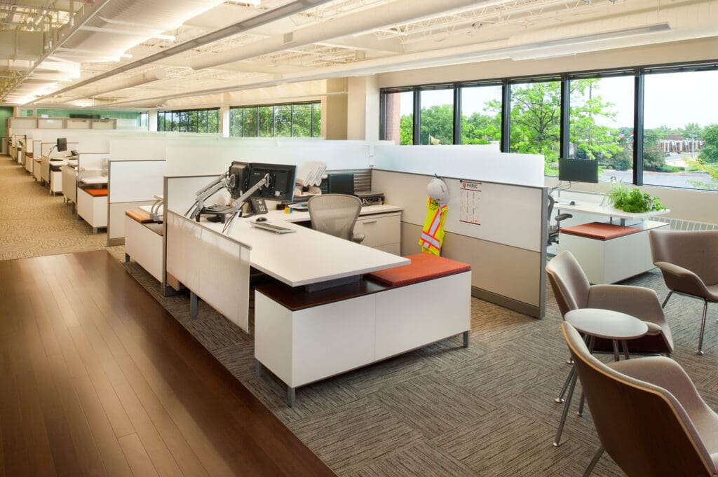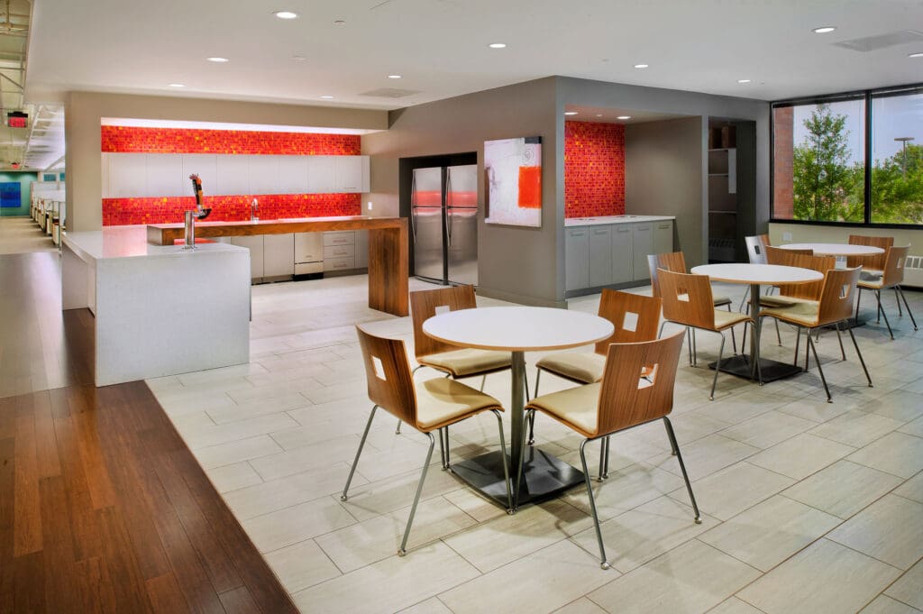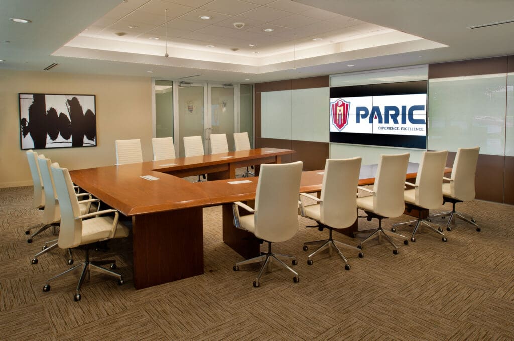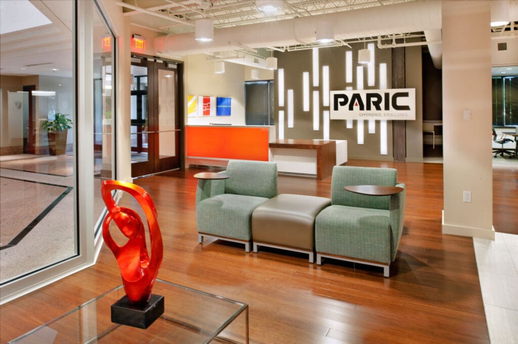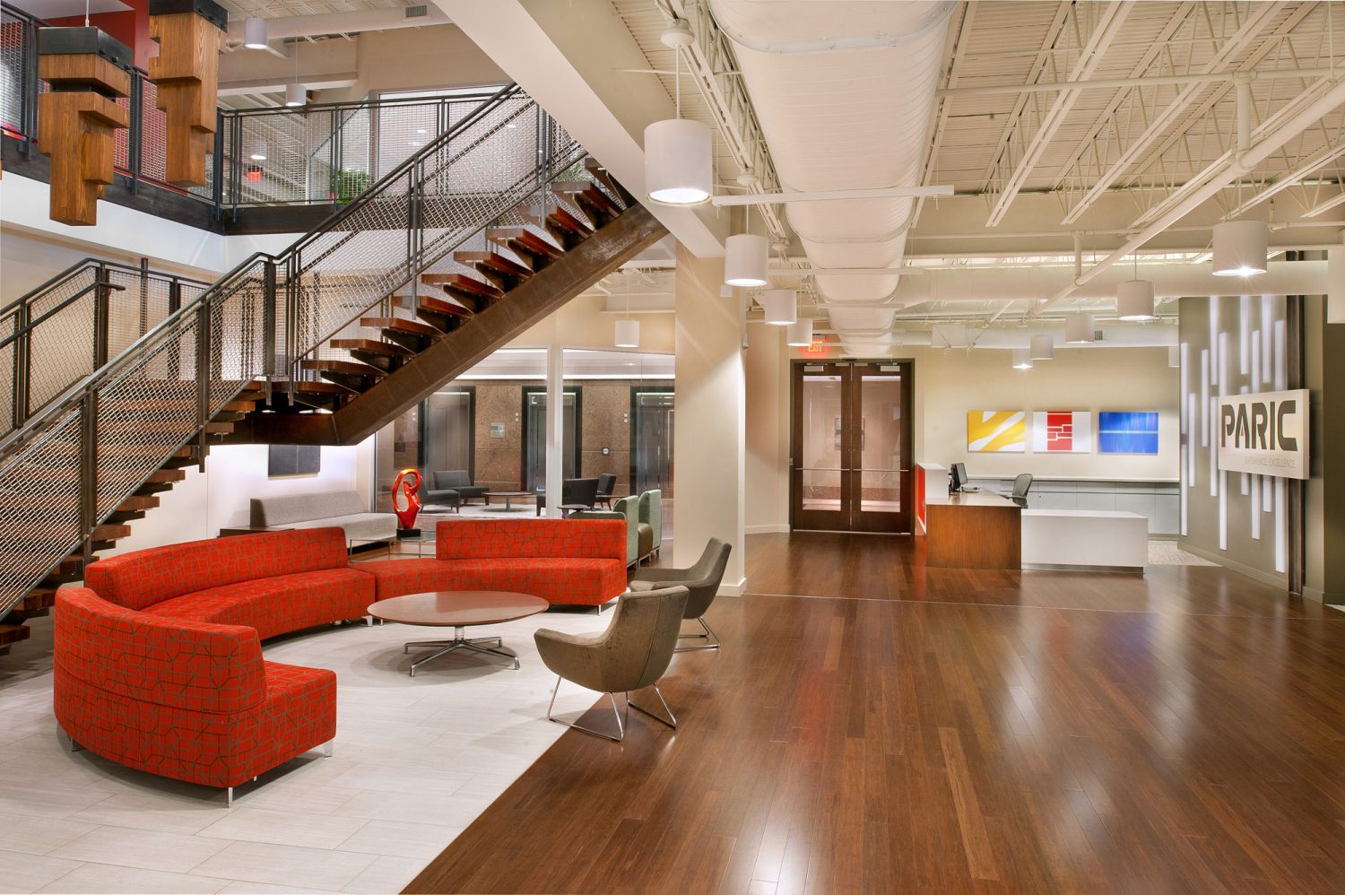 PARIC completed this 34,508 sq. ft. interior renovation of a two-story suite in Westport Plaza for their new office headquarters. The first floor features an elegant lobby, a kitchen/bar area, four conference rooms, the boardroom, as well as PARIC University, a large classroom-style conference room with advance audio-visual capabilities including a SmartBoard. The second floor features an open office plan with cubicles and common areas for collaboration. Additionally, the second floor features three more conference rooms and an expanded kitchen/bar area.