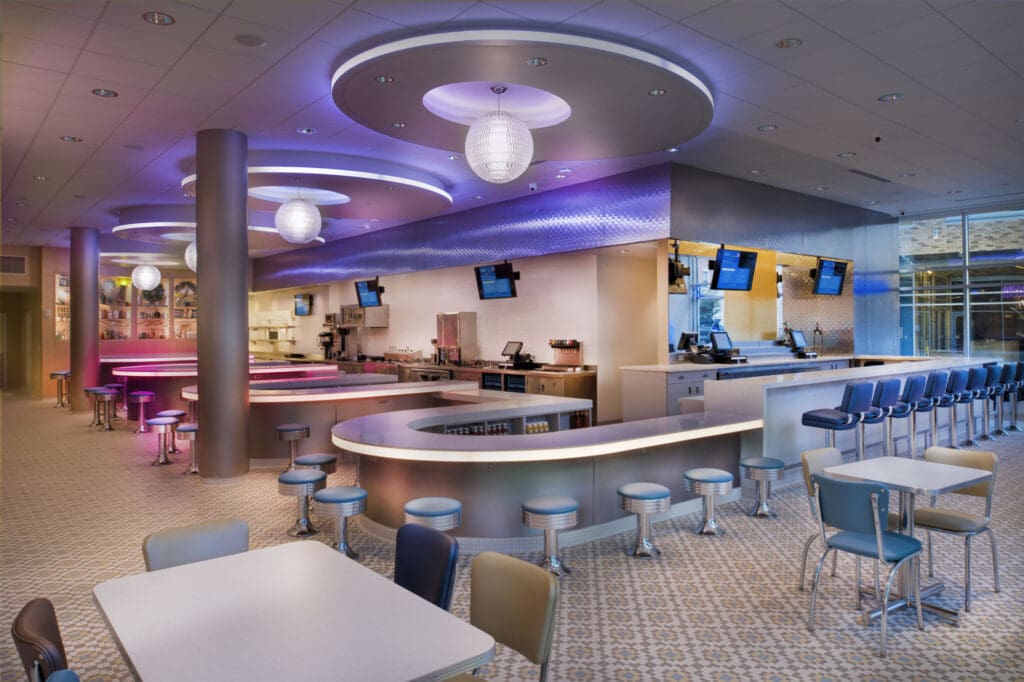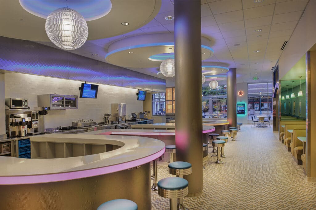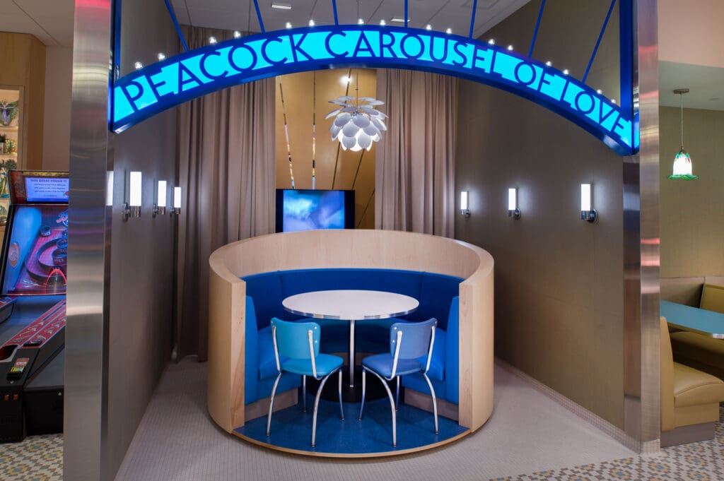 The interior of the restaurant features four brightly lit U-shaped dining counters, display cases of peacock-themed memorabilia, two skee-ball games, and a functioning jukebox- all brightly colored and illuminated to resemble the avian namesake of the restaurant. For more intimate occasions, there is even a special private booth called the “Peacock Carousel of Love” that can be reserved for an unforgettable dining experience. The Peacock Diner is an old-time diner with a brilliant modern twist.