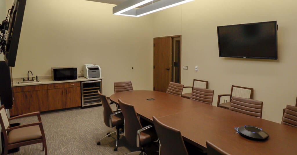 Red River Valley REA relocated their headquarters facility to a new location on 15 acres near their existing solar field in Marietta, Oklahoma. The new facility consists of a 18,000 sq. ft. office building, 21,000 sq. ft. warehouse, 6,800 sq. ft. maintenance building, and 25,000 sq. ft. covered parking structure. The new facility utilizes LED lighting throughout, geothermal HVAC, and other high efficiency design concepts. A hardened space was constructed to protect sensitive IT servers, infrastructure, dispatch services, and shelter in case of an emergency.