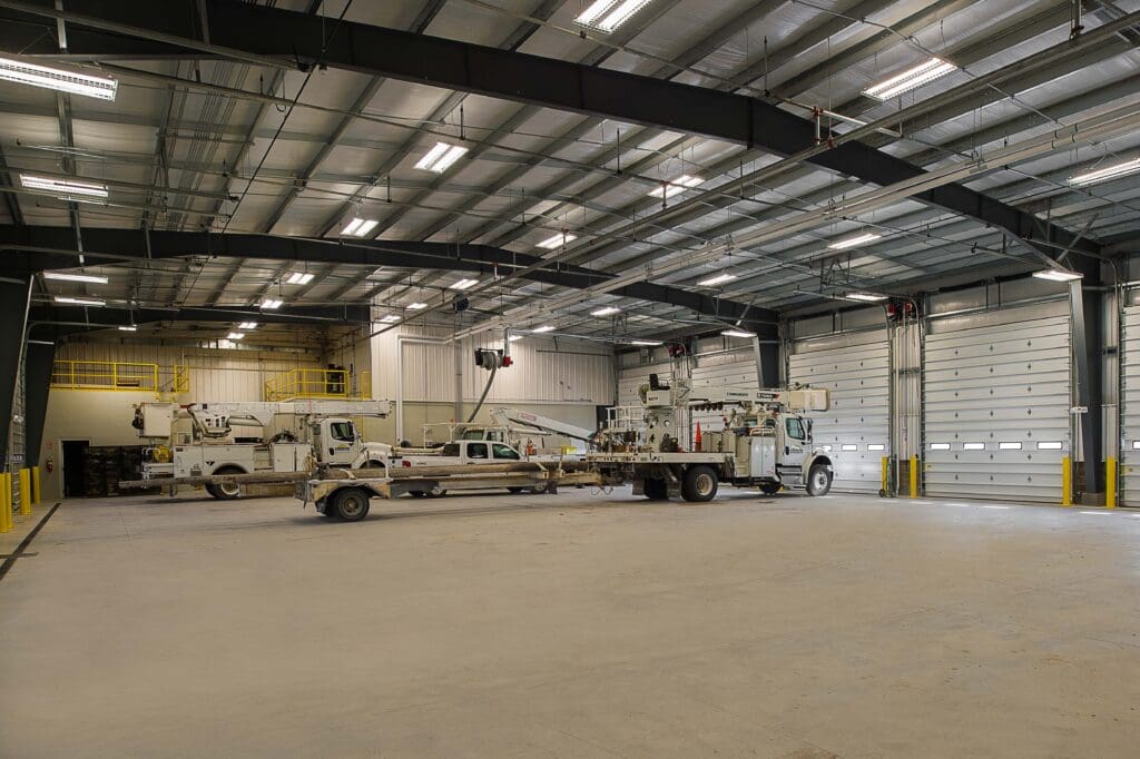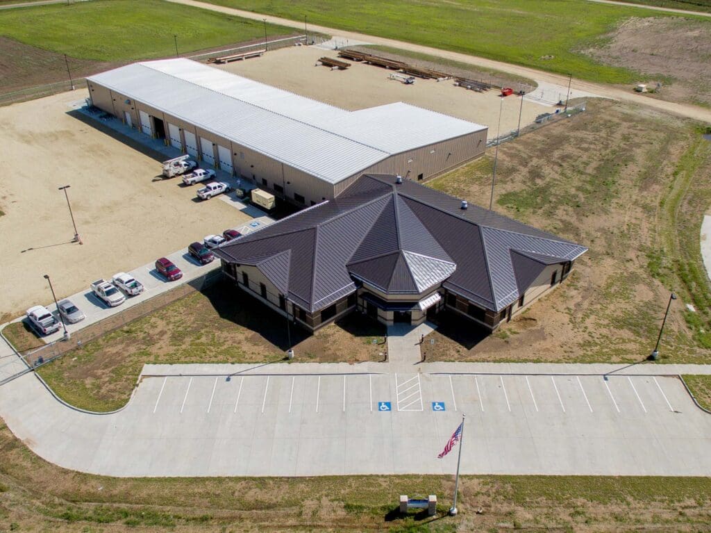 The new headquarters facility consists of 34,000 sq. ft. of office, vehicle storage, and a warehouse. Structural steel framing and a brick façade supports the office, while the warehouse and vehicle storage buildings are pre-engineered metal structures. The property has extensive security fencing and access control protecting the assets of the cooperative.