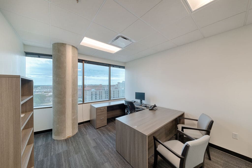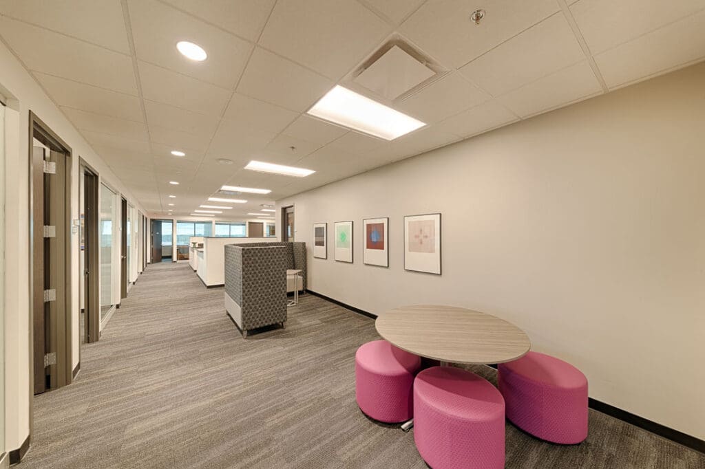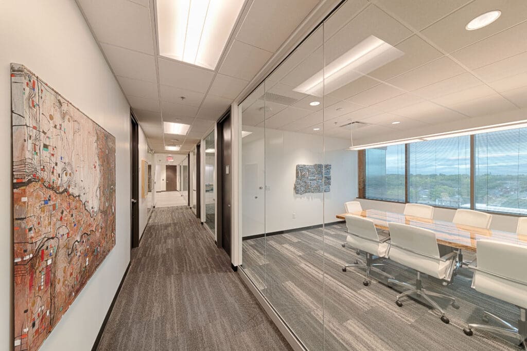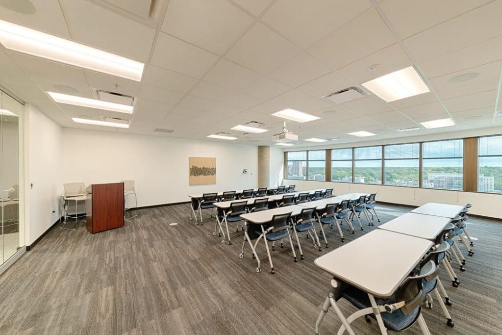 Sandberg Phoenix & von Gontard’s Kansas City office is located on the 10th floor overlooking the Plaza. With occupied spaces above and below, the space was transformed in five months from an open concept office to one more suited for a law firm. The project incorporated large expanses of glass into 30 private offices, nine conference rooms, a training center, a break room, and open office space.