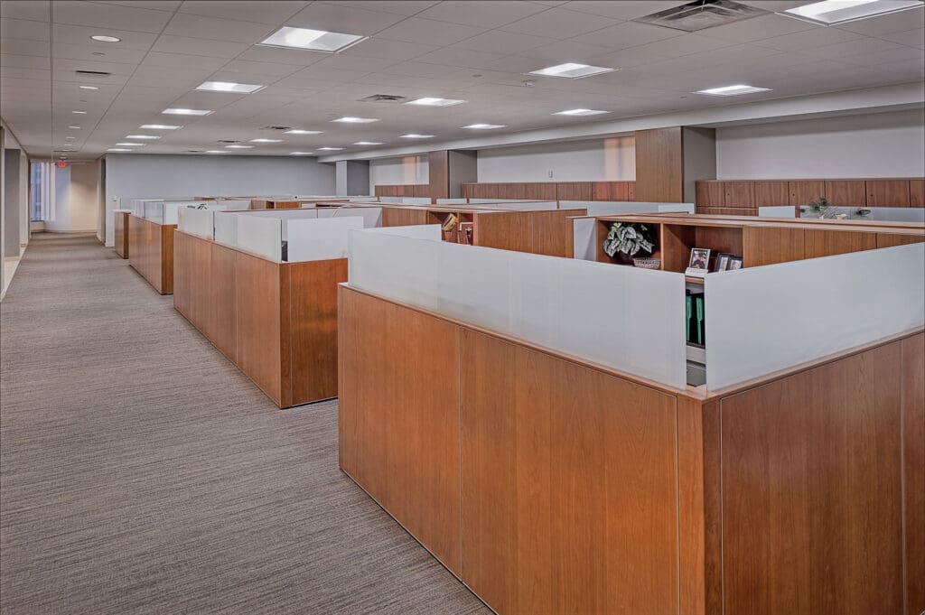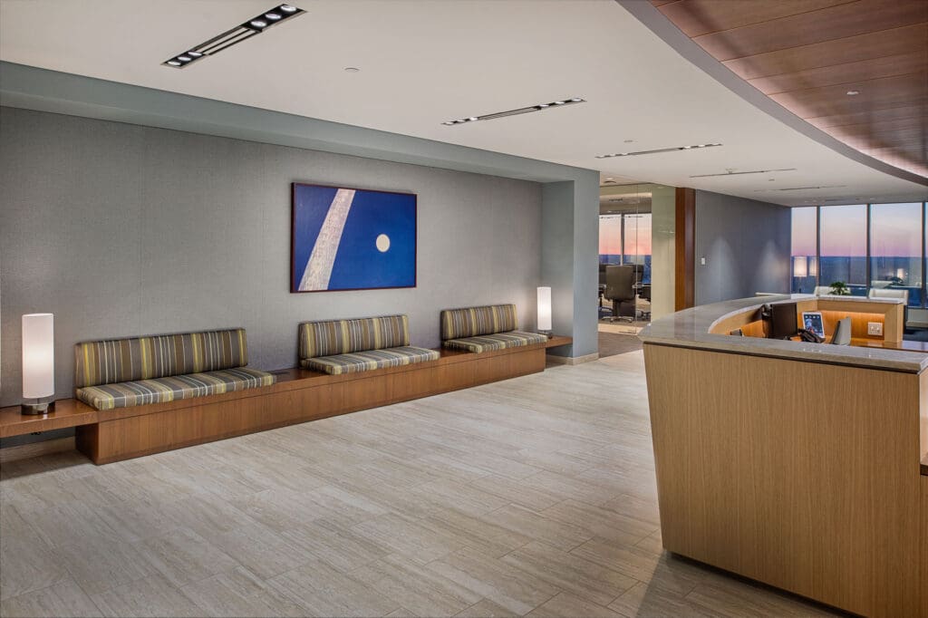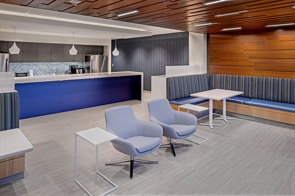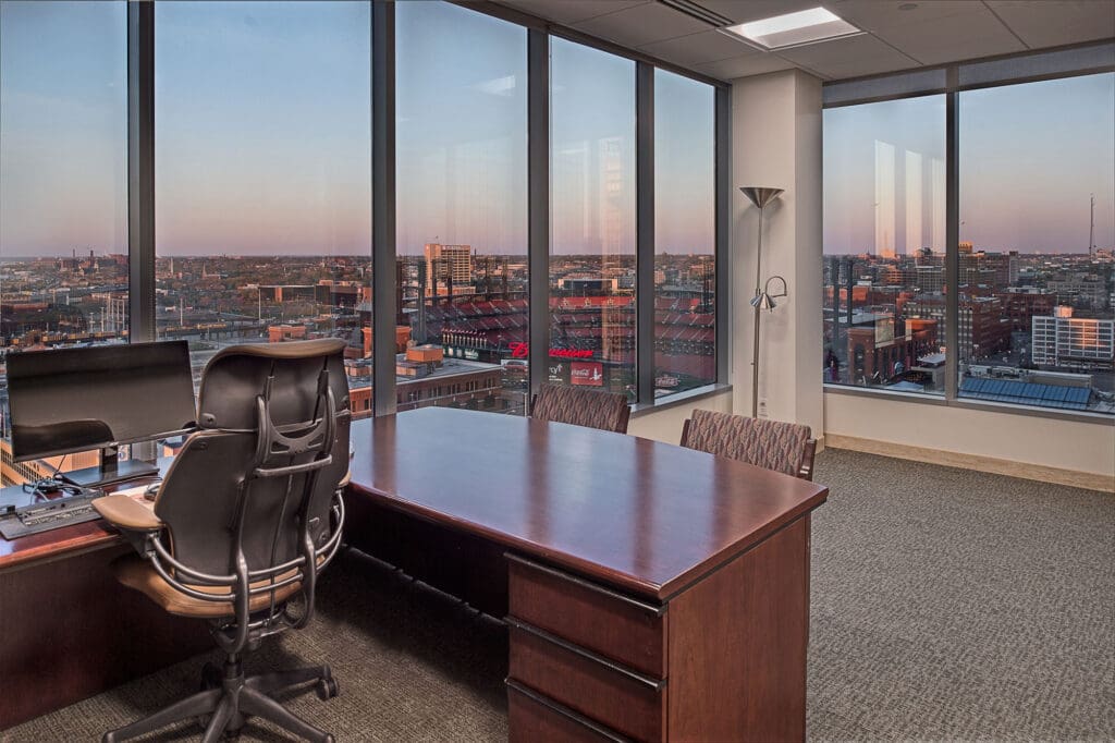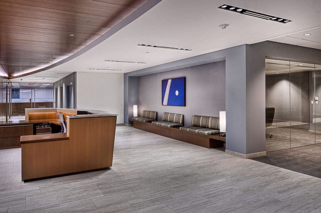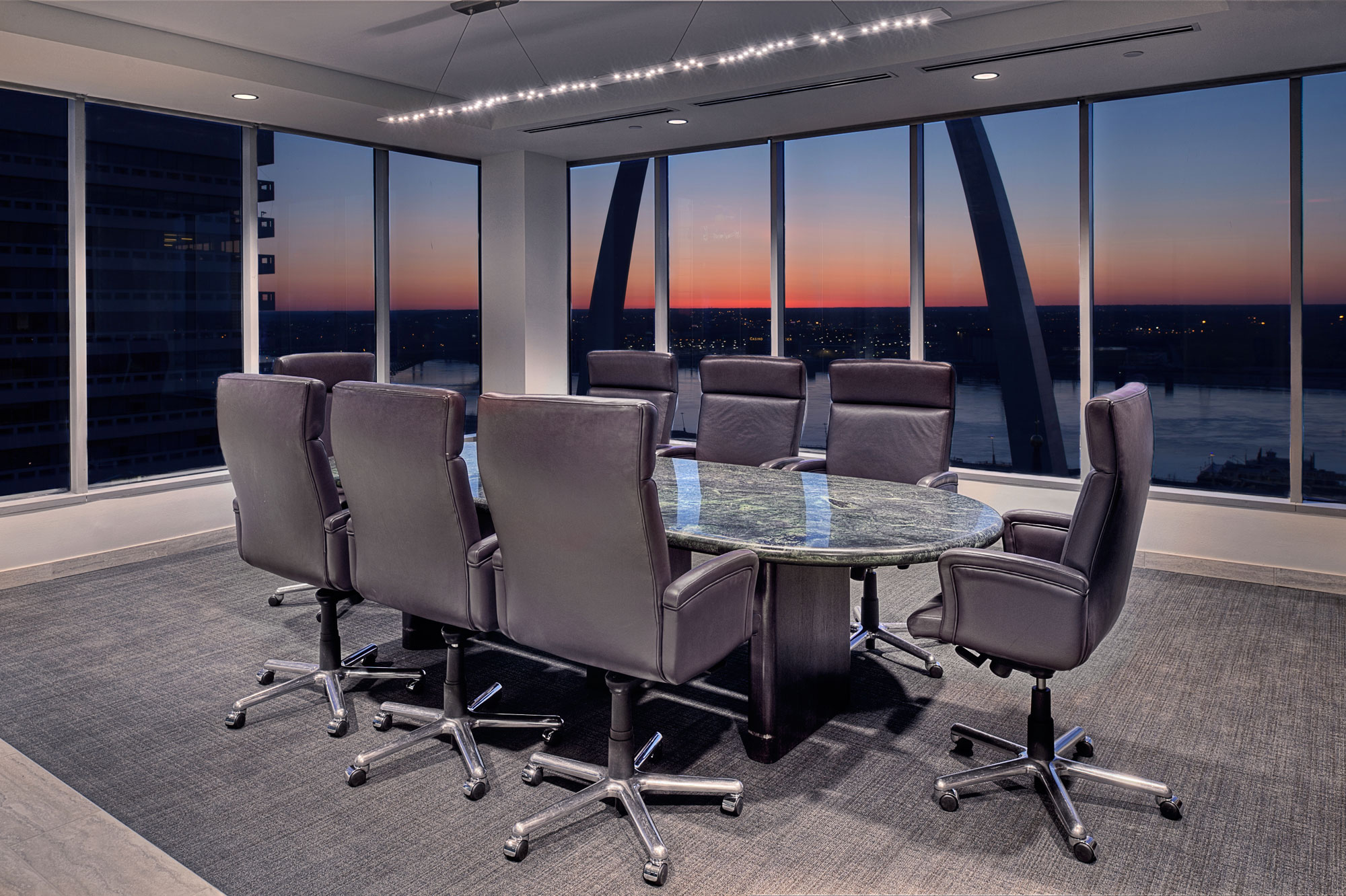 PARIC completed the renovation of Schlichter Bogard and Denton’s 21,000 sq. ft. downtown office. This project included the renovation of interior storefronts for 27 private offices, reception area, bathrooms, and five conference rooms. Features of the office include a custom Sapele wood veneer reception desk with matching wood panel walls and ceiling, and an open cafe’ room overlooking Busch Stadium with a custom Sapele Wood veneer ceiling.