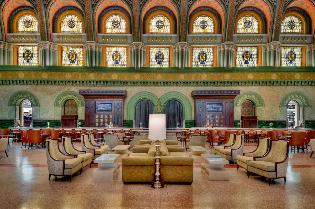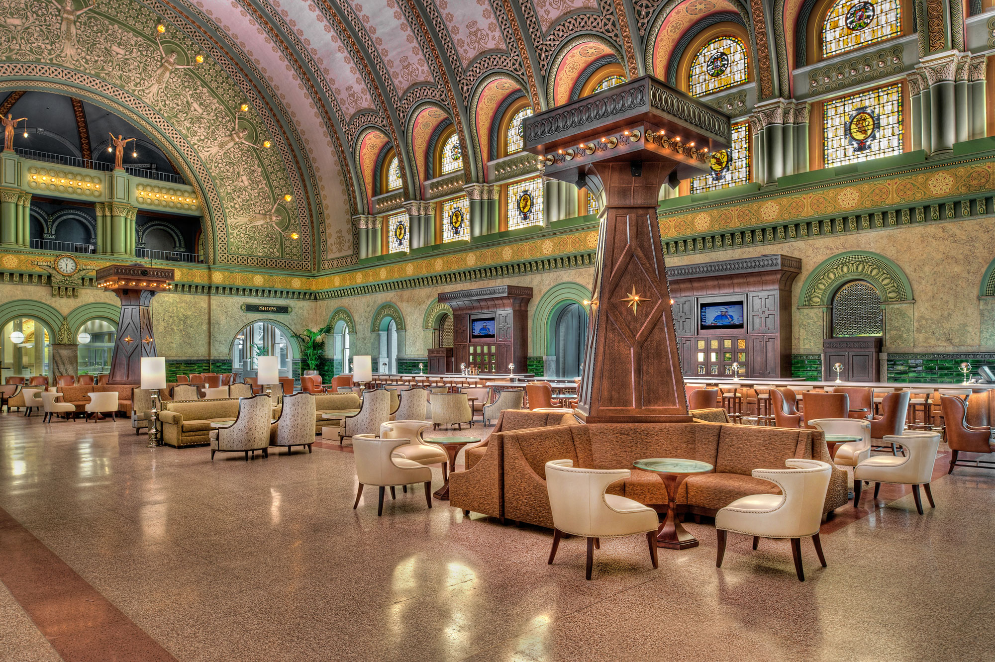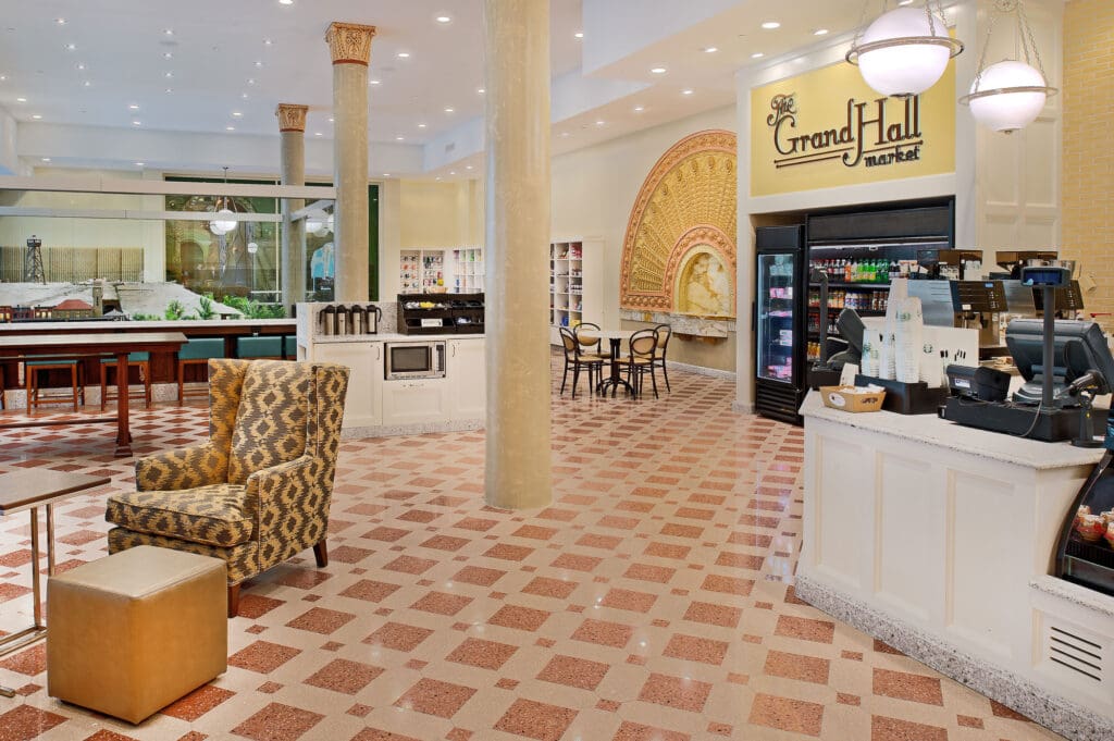 The Market is immediately adjacent to the Grand Hall and was completed as a part of the same project. This portion now includes, a coffee shop, a 3D train display, custom decorative terrazzo tile flooring, new glass storefronts, Venetian plaster work and built-in custom cabinetry. This section also included the restoration of artisanal paintings, arches, cornices, flat plaster walls and columns.