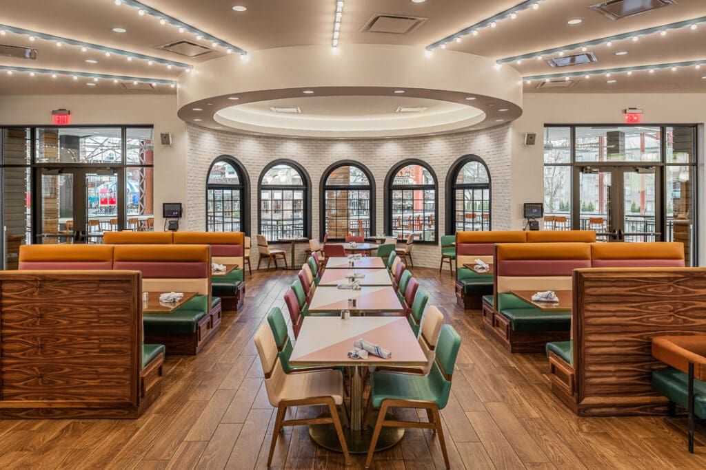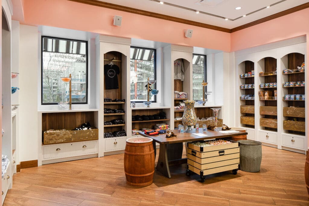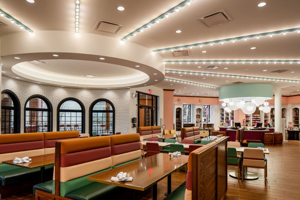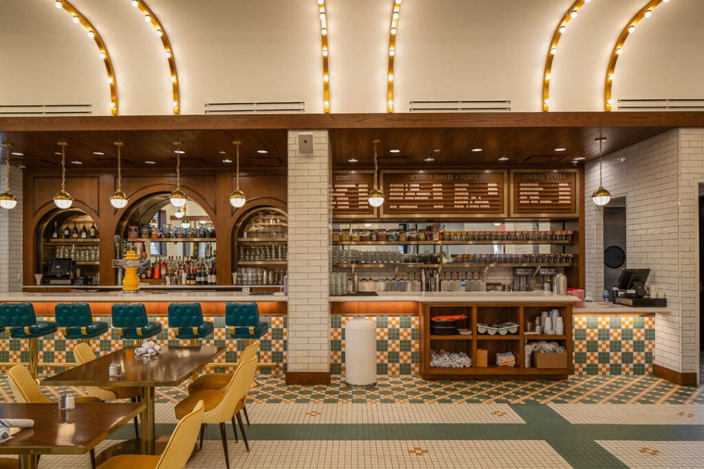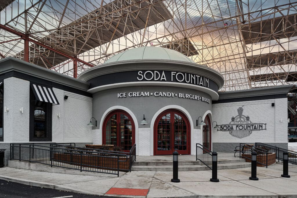 The Union Station Soda Fountain is a 13,000 sq. ft. restaurant fit-out located between the new carousel and aquarium. The interior features 50’s-style decor with menu offerings such as ice cream sundaes, shakes, phosphates, candy, popcorn, sandwiches, and burgers.