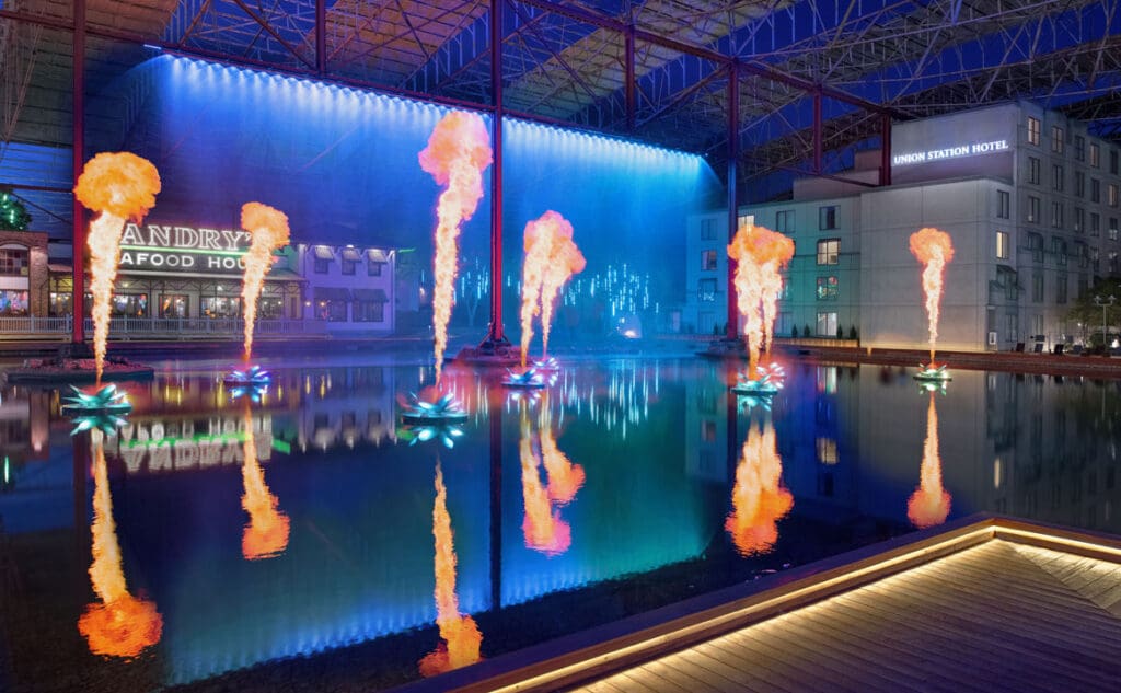 This multi-million-dollar breathtaking fire, water, and light show features a 100-foot-long waterfall with 50 nozzles that spray water 40 feet down into the lake. Accompanied by music the lights turn the water into a variety of glowing colors accented by the icicle lights decorating the surrounding trees. Eight floating lotus shaped pods on the lake shoot flames 25 feet into the air.