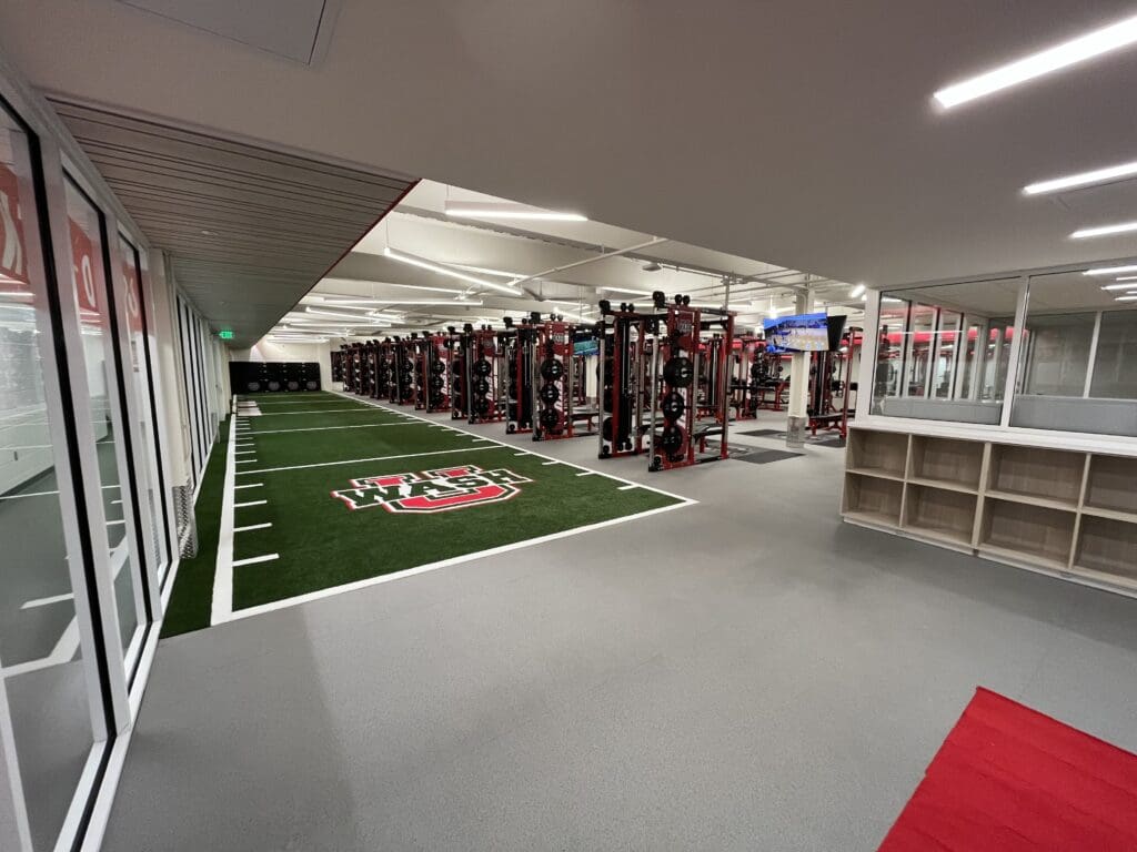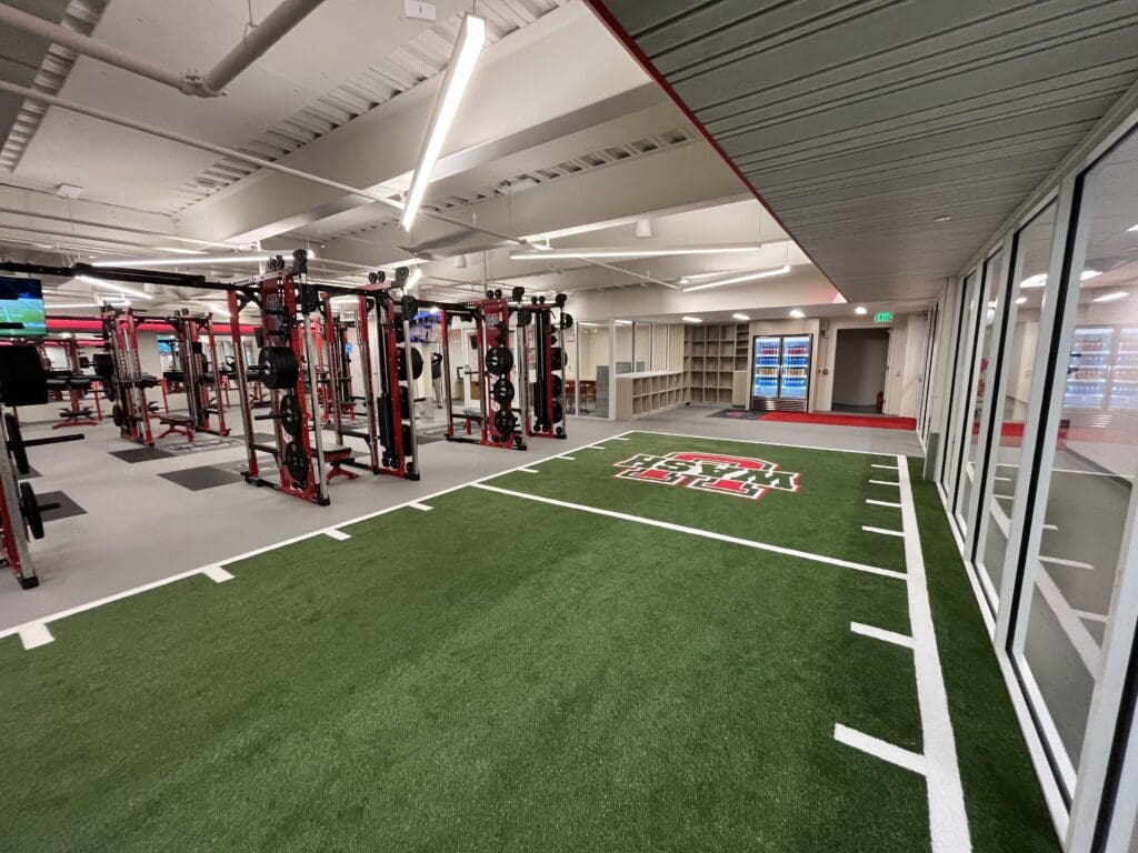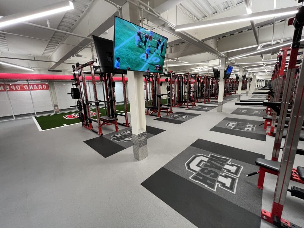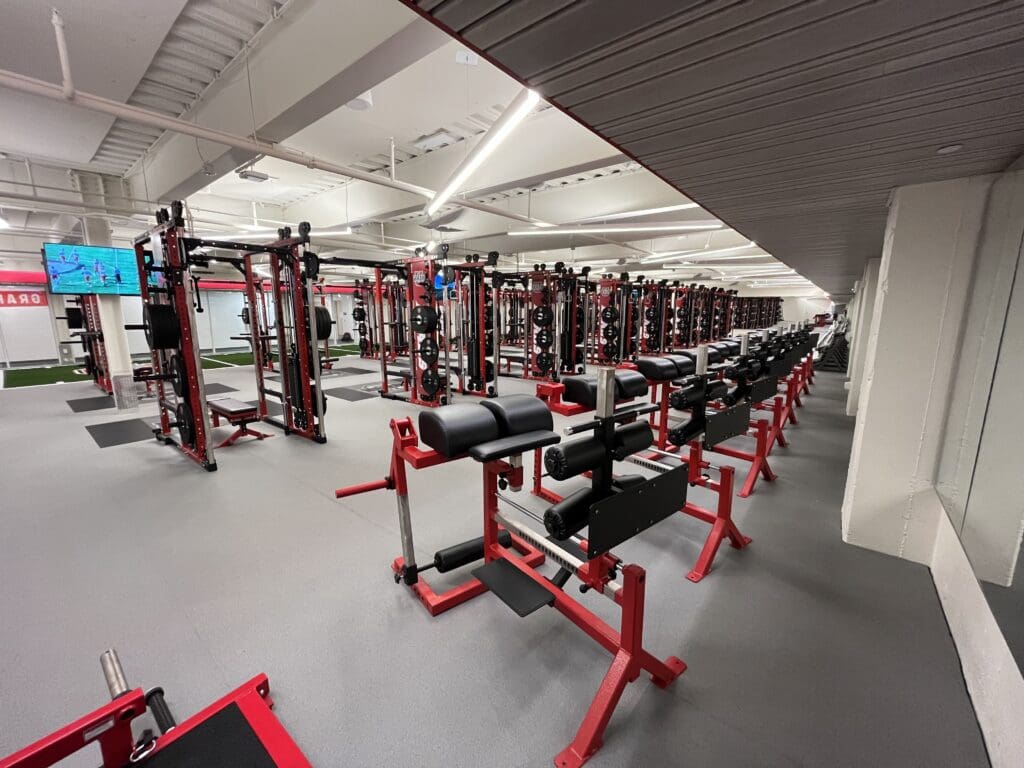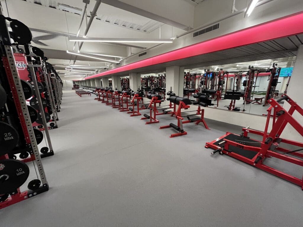 Designed to accommodate up to 80 athletes at a time, the 7,000 sq. ft. Sports Performance Center enhances the experience of student athletes at Washington University in St. Louis. The center houses weight training stations, cardio space, a stretching & sprint zone, and a medicine ball workout area.