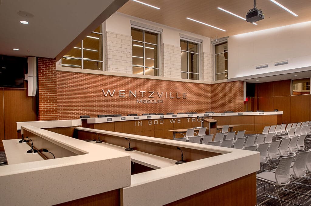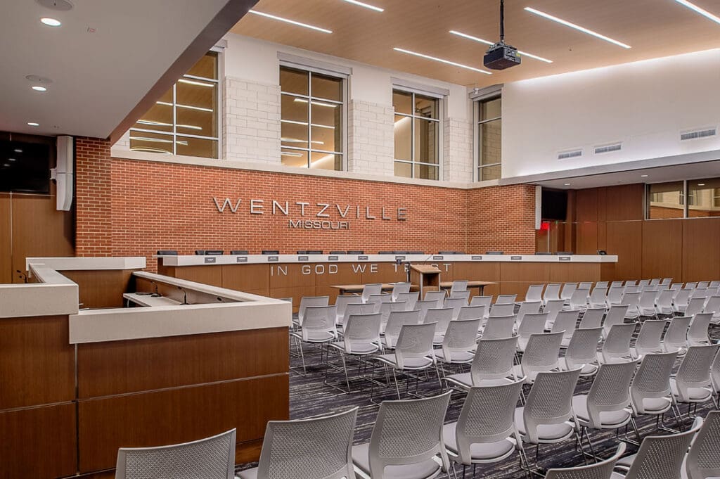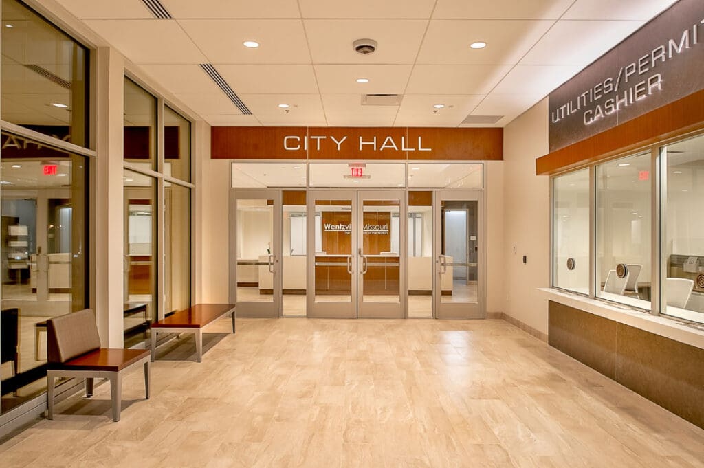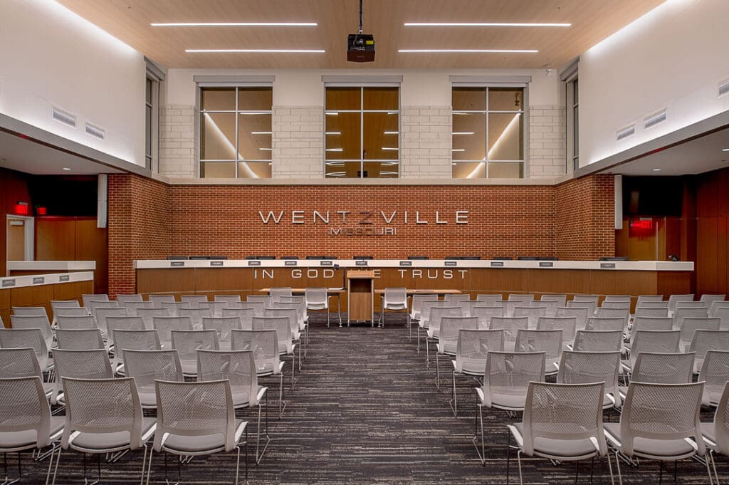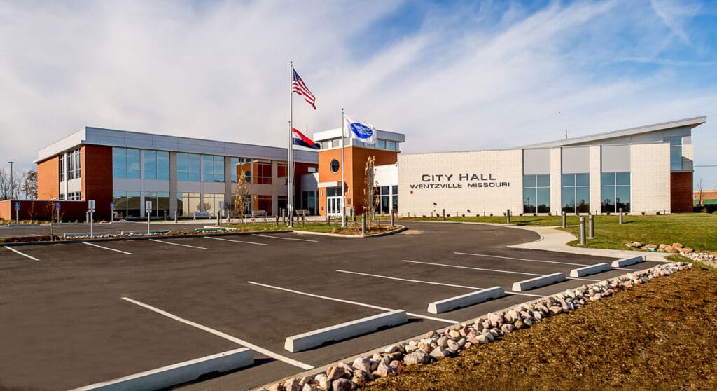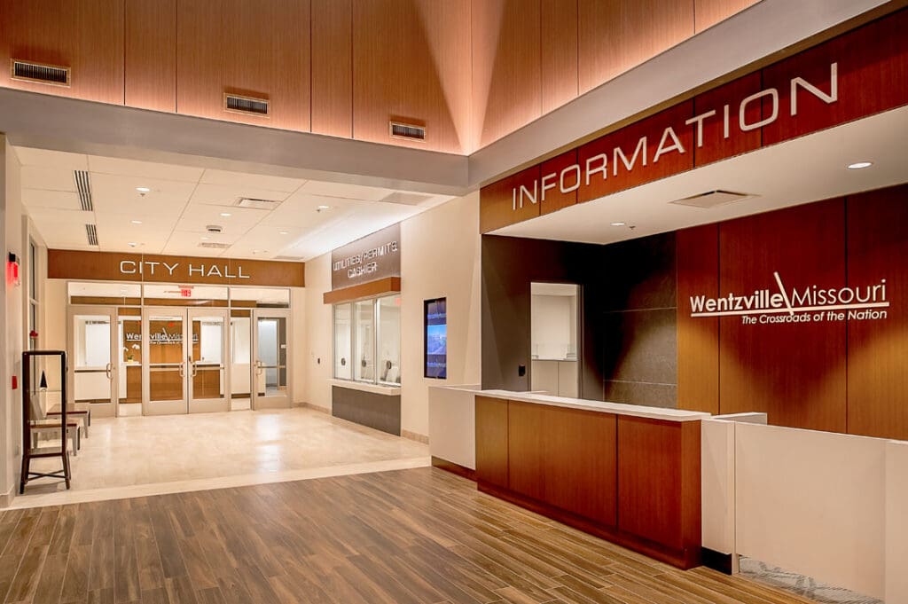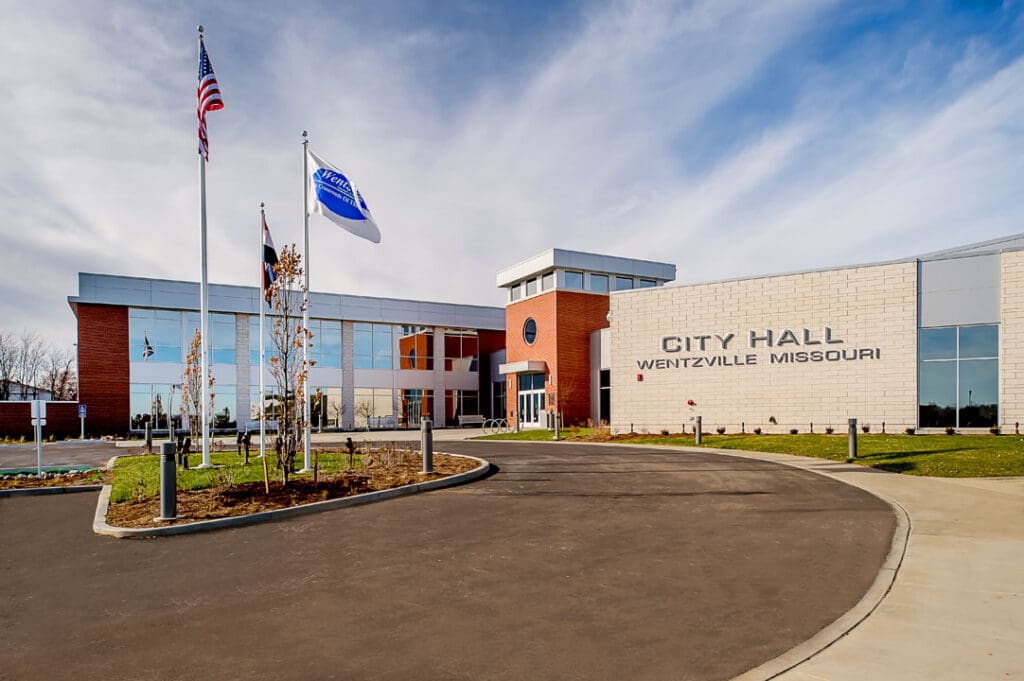 This new 44,474 sq. ft. city hall was constructed across the parking lot from the existing Wentzville Police Department. The new structure was built in order to help consolidate city offices to provide more efficiency and better customer service for residents and visitors. This new 2-story facility houses city government offices including city council and judicial chambers, the finance, community development, public works, city administration, procurement, parks and recreation, and human resources departments, conference rooms, and a break room.